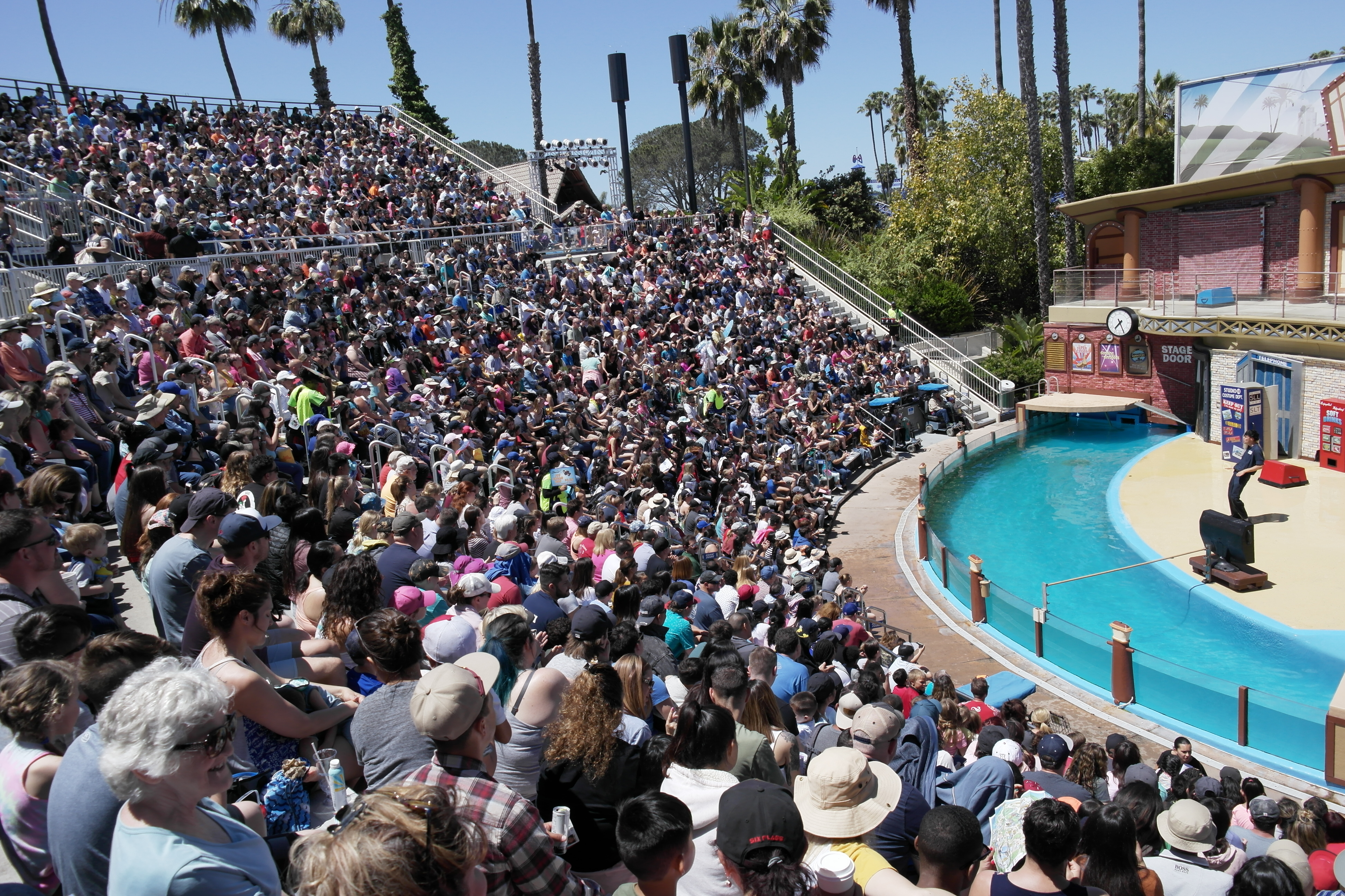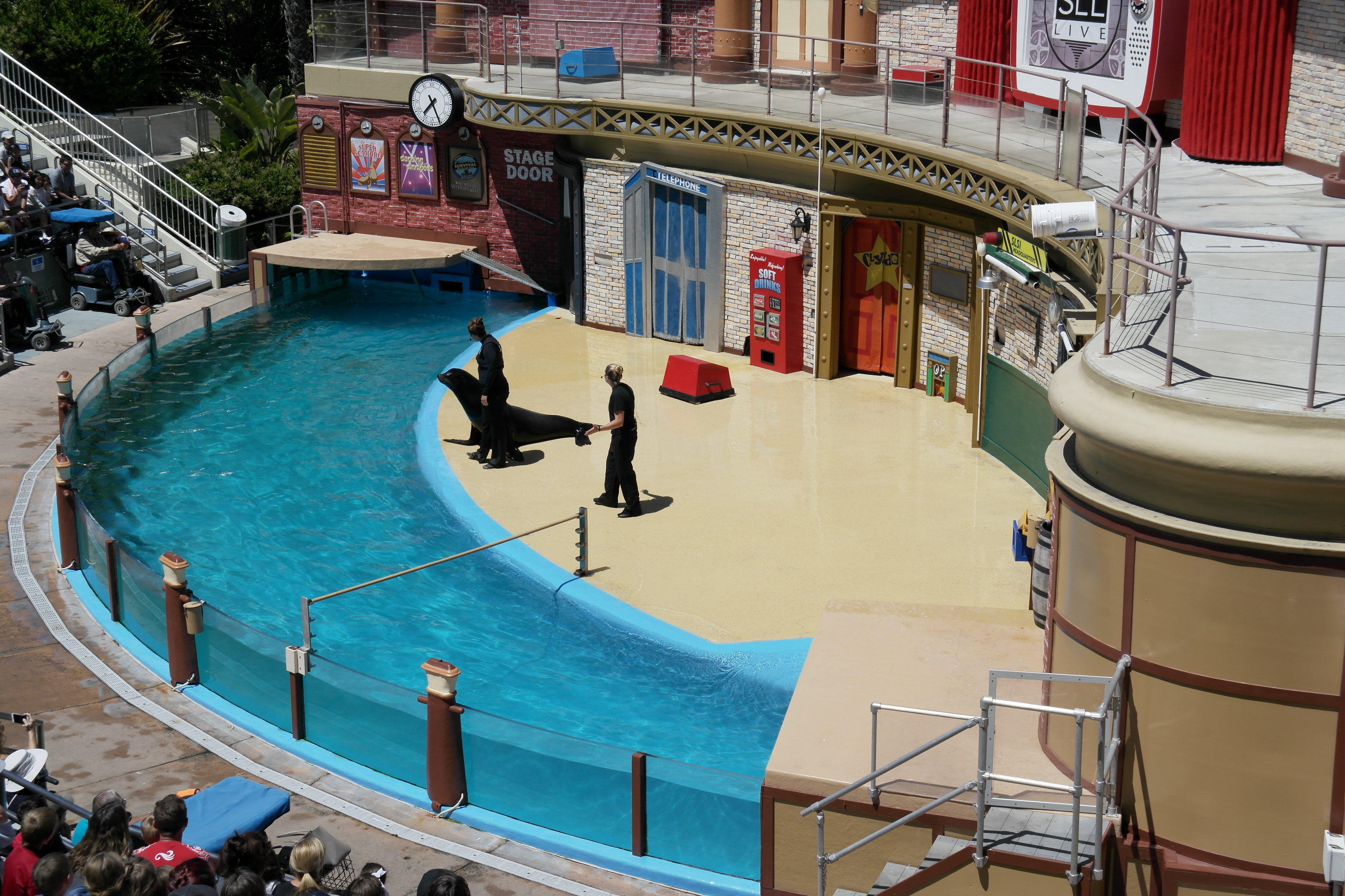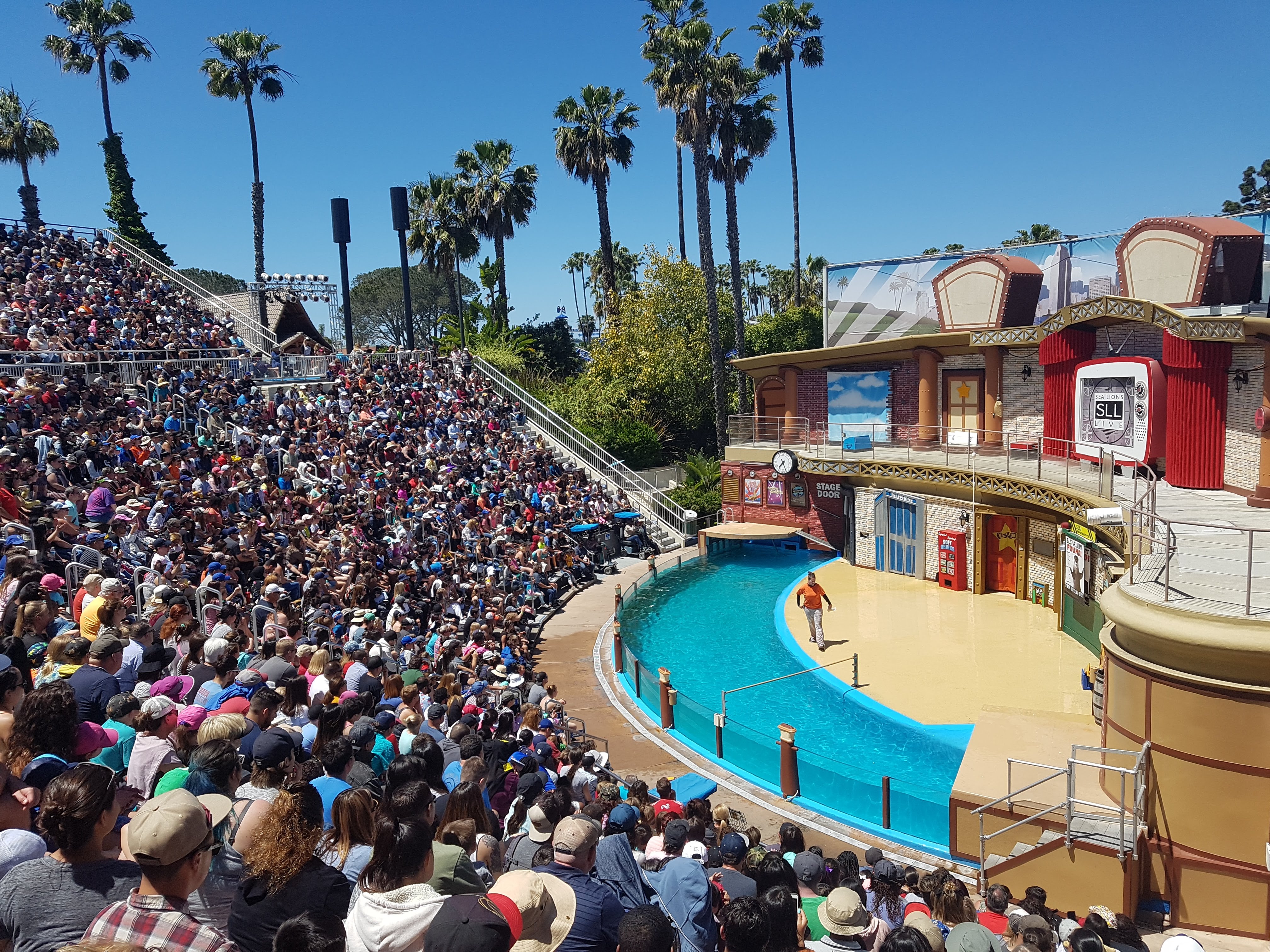 여기서부터는 물개쇼! 시작 20분 전에 이렇게 자리가 모두 찼다. 시작 20분 전부터 관객의 여흥을 돋구기 위한 재미난 쇼와 행사를 한다. 무대에 나온 진행자가 60~70년대 노래에 맞춰 뮤지컬처럼 춤을 추고 있다.