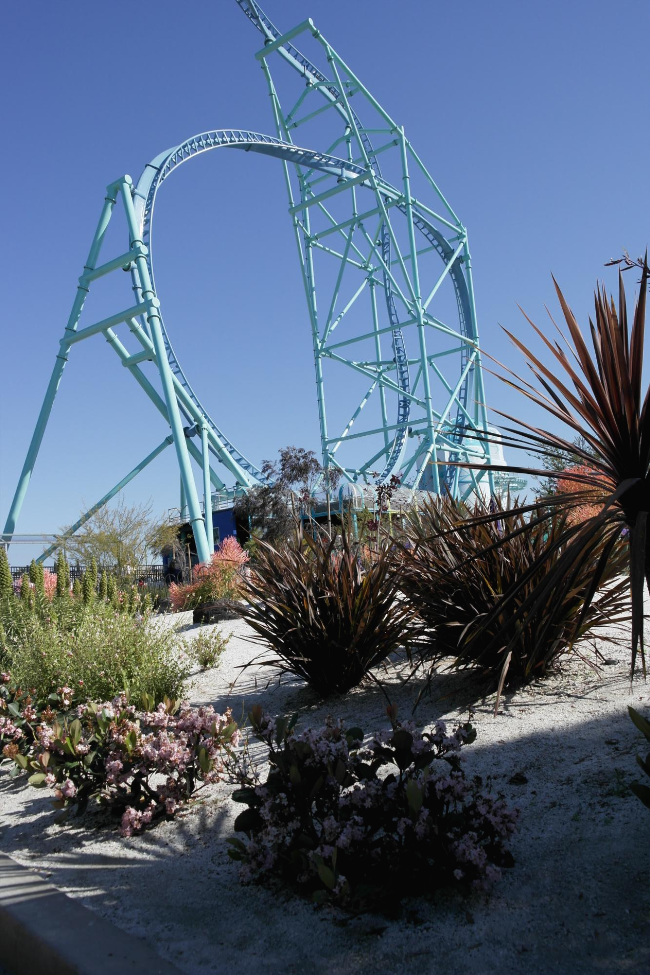 남부 캘리포니아의 건조한 기후가 느껴지는 정원 모습. 뒤에 보이는 게 공포의 전기뱀장어(Electric Eel)라는 탈거리다. 보기만해도 무섭다.