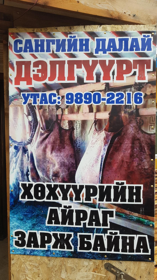 몽골 시골에서는 마유주를 만들 때 손 있는 날과 없는 날을 따져서 만든다고 한다. 마유주를 파는 어느 시골 마을 마트 광고판. 광고판을 보고 마유주를 마시기 위해 잠시 차를 멈췄다.