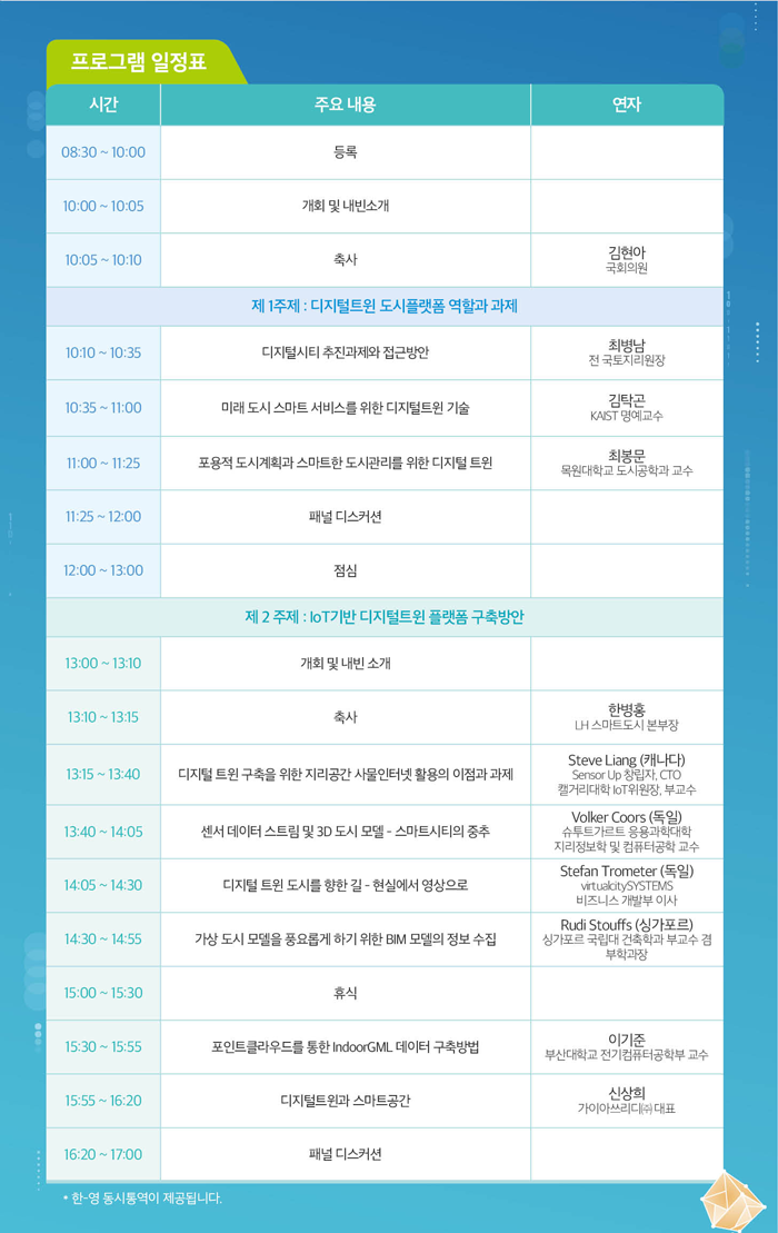 오는 8월 8일 COEX에서 열리는 LH 주최 Digital Twin 컨퍼런스에서 '디지털트윈과 스마트스페이스'라는 주제로 발표 예정입니다.