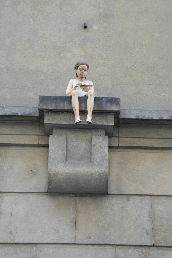 건물 외벽을 장식하고 있는 책 읽는 소녀상.