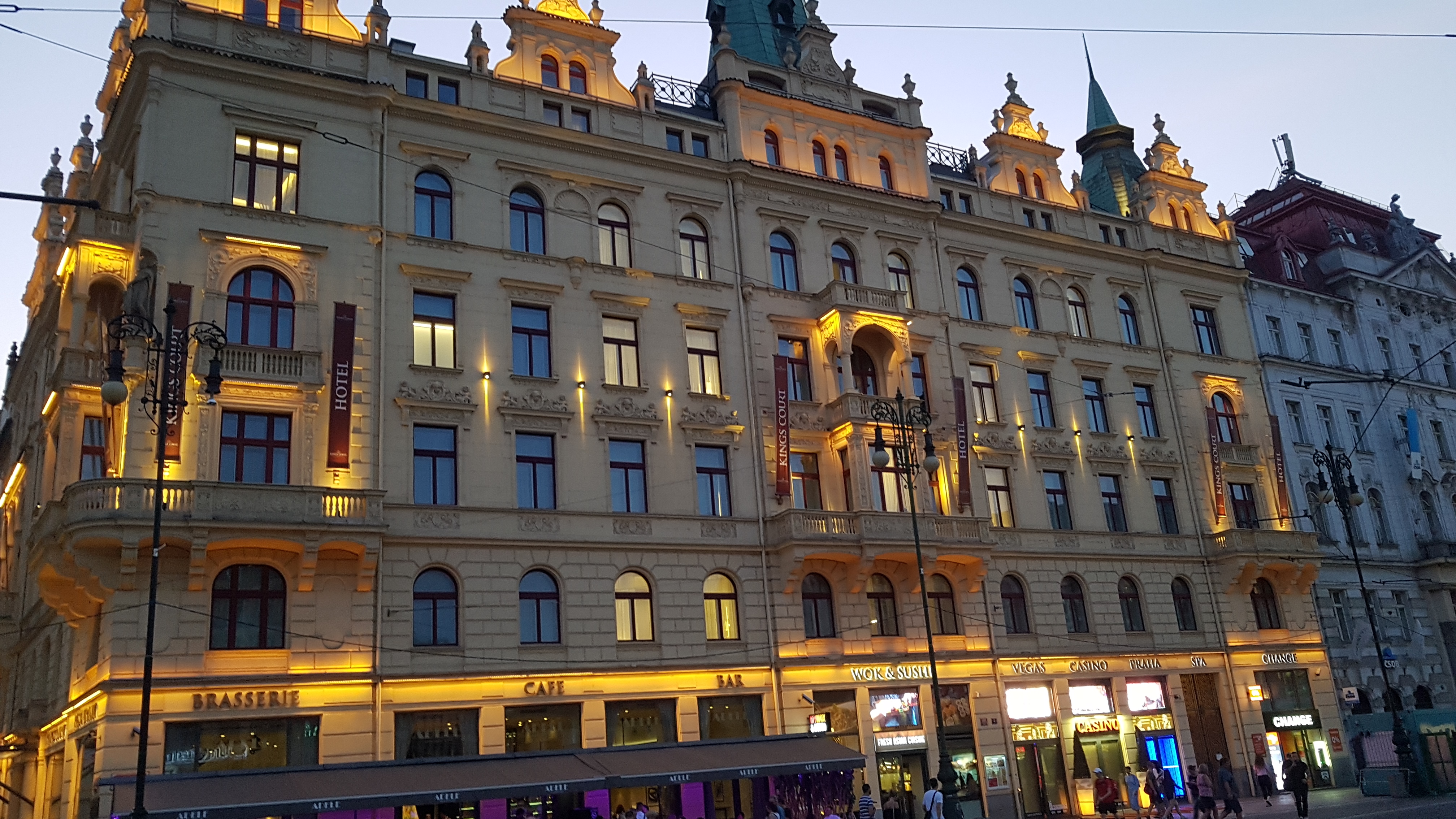 이번에 프라하에서 묵었던 호텔은 호텔 킹스코트(Hotel Kings Court)였다. 매우 만족스러운 호텔이었는데 위치, 객실, 음식. 서비스 어느 하나 빠지지 않는 좋은 호텔이었다. 딸애의 표현을 빌자면 "위치도 좋고 방도 좋고 음식도 좋은 호텔!"이었다. 객실은 넓고 깨끗했으며, 한국인을 비롯한 동양인이 많이 오는지 아침 부페 중에 초밥도 있다. 무엇보다 위치가 좋은데 호텔 바로 앞에 작은 광장이 있고 주변에 괜찮은 식당이 많을 뿐더러 쇼핑할 수 있는 슈퍼나 백화점도 바로 앞에 있다. 트렘이나 지하철도 바로 앞에서 탈 수 있다. 특히, 구도심의 시작인 화약탑 바로 옆에 호텔이 있어서 언제고 구도심에 쉽게 갈 수 있다.