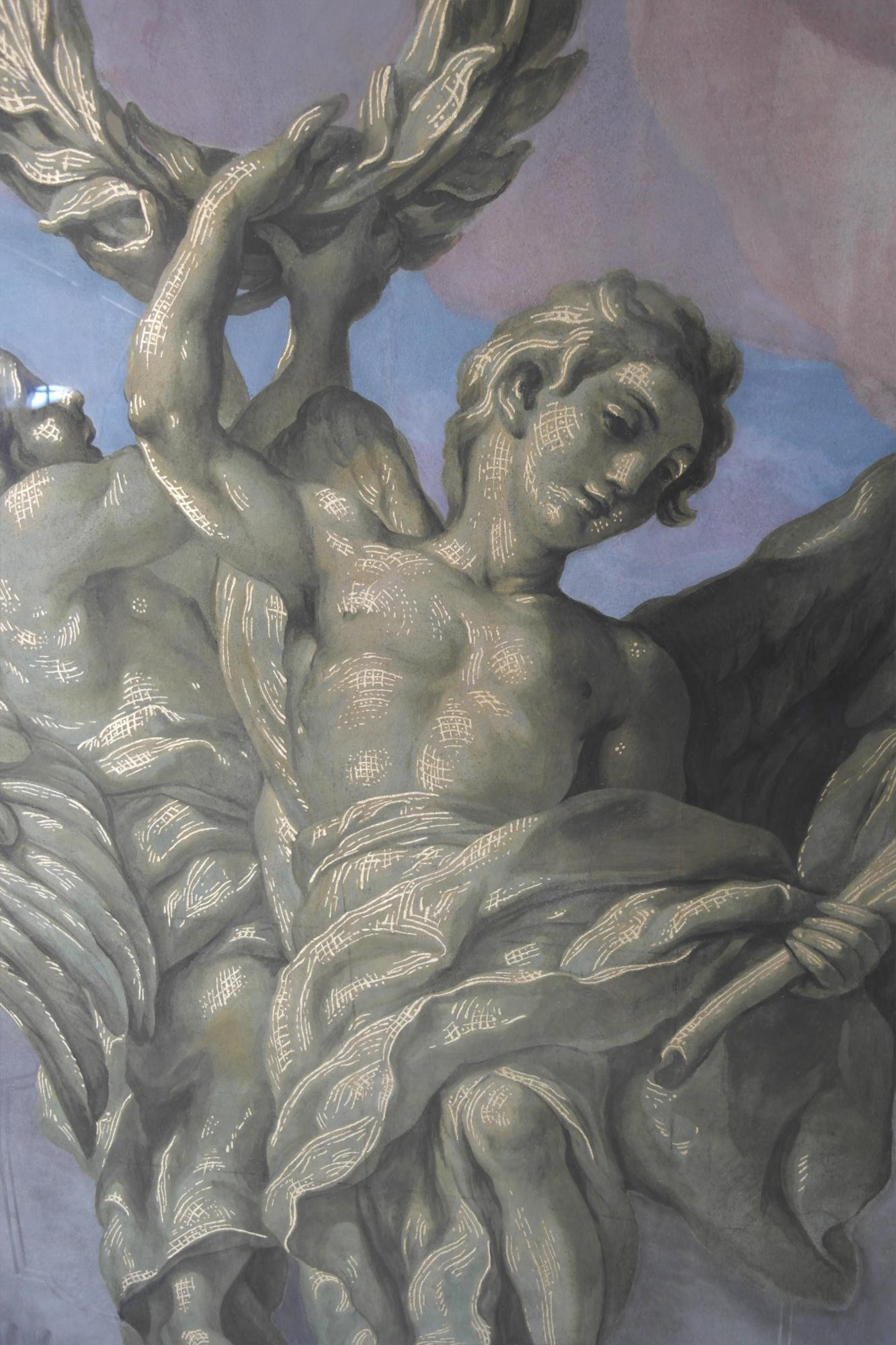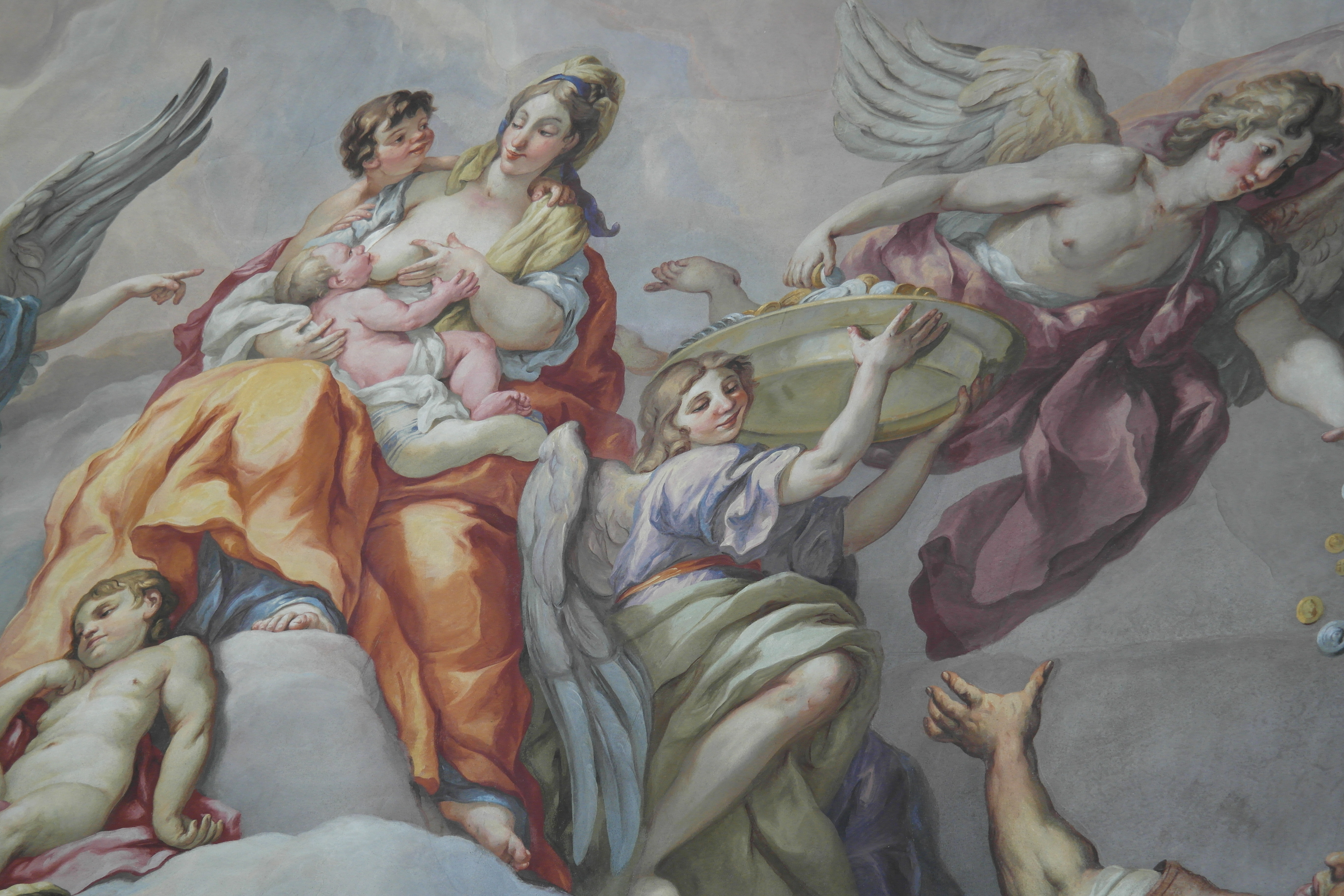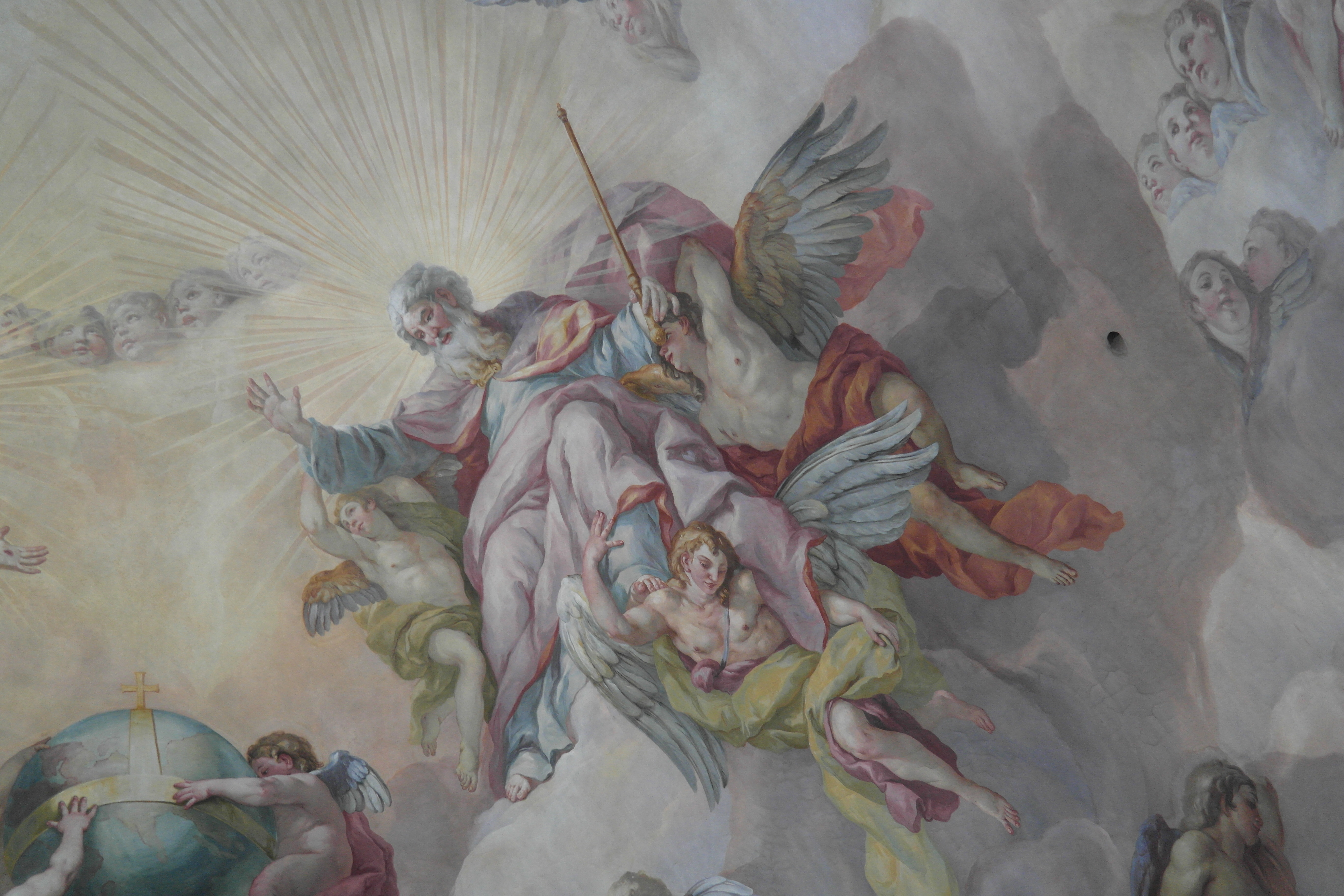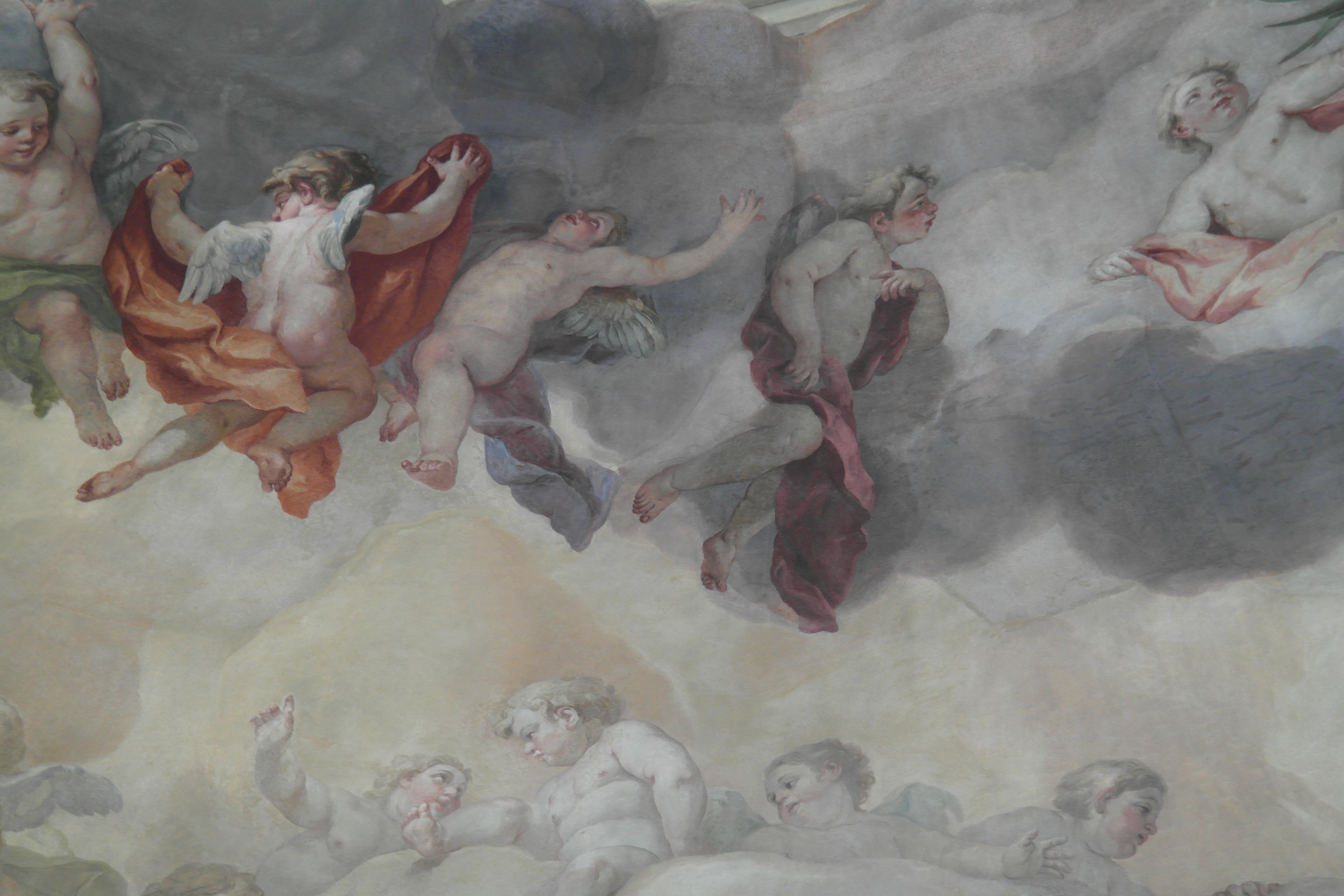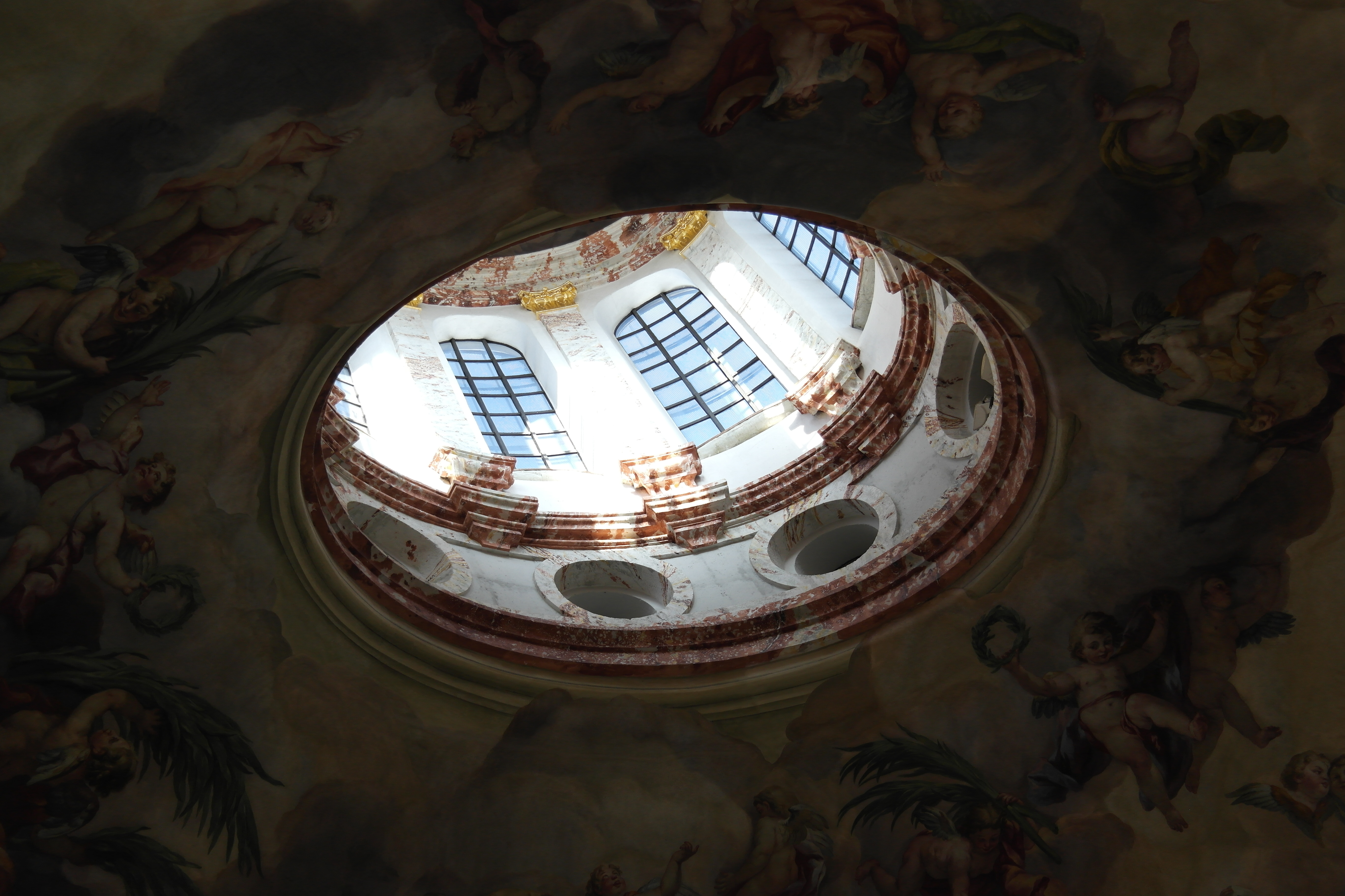 엘리베이터는 꽤 높은 곳까지 올라간다. 엘리베이터 타고 오른 뒤 살펴본 카를 교회 천정 장식.