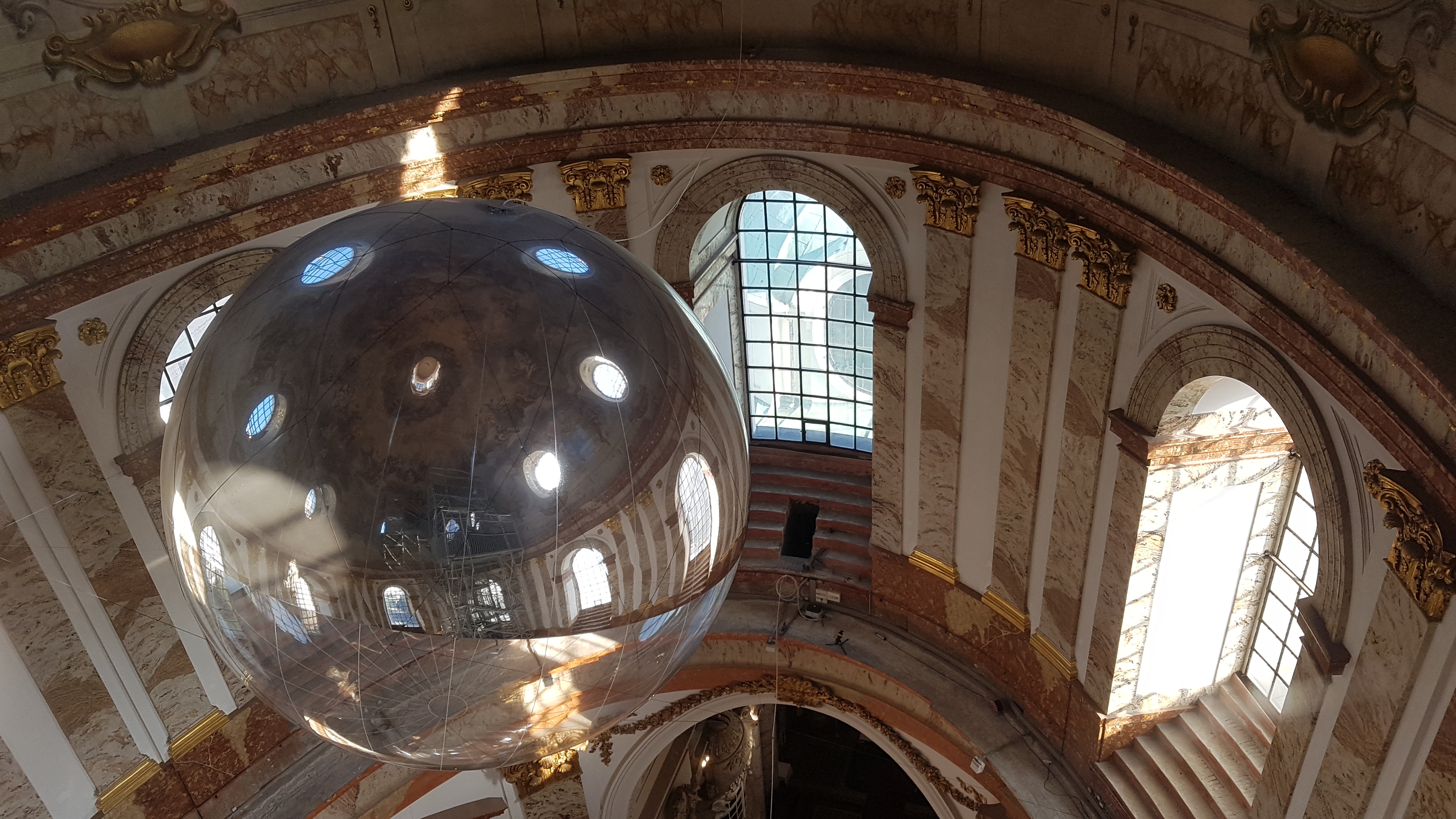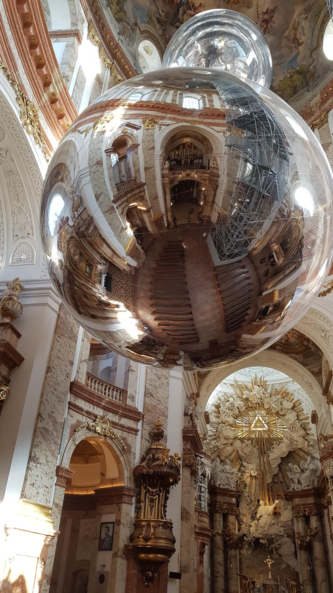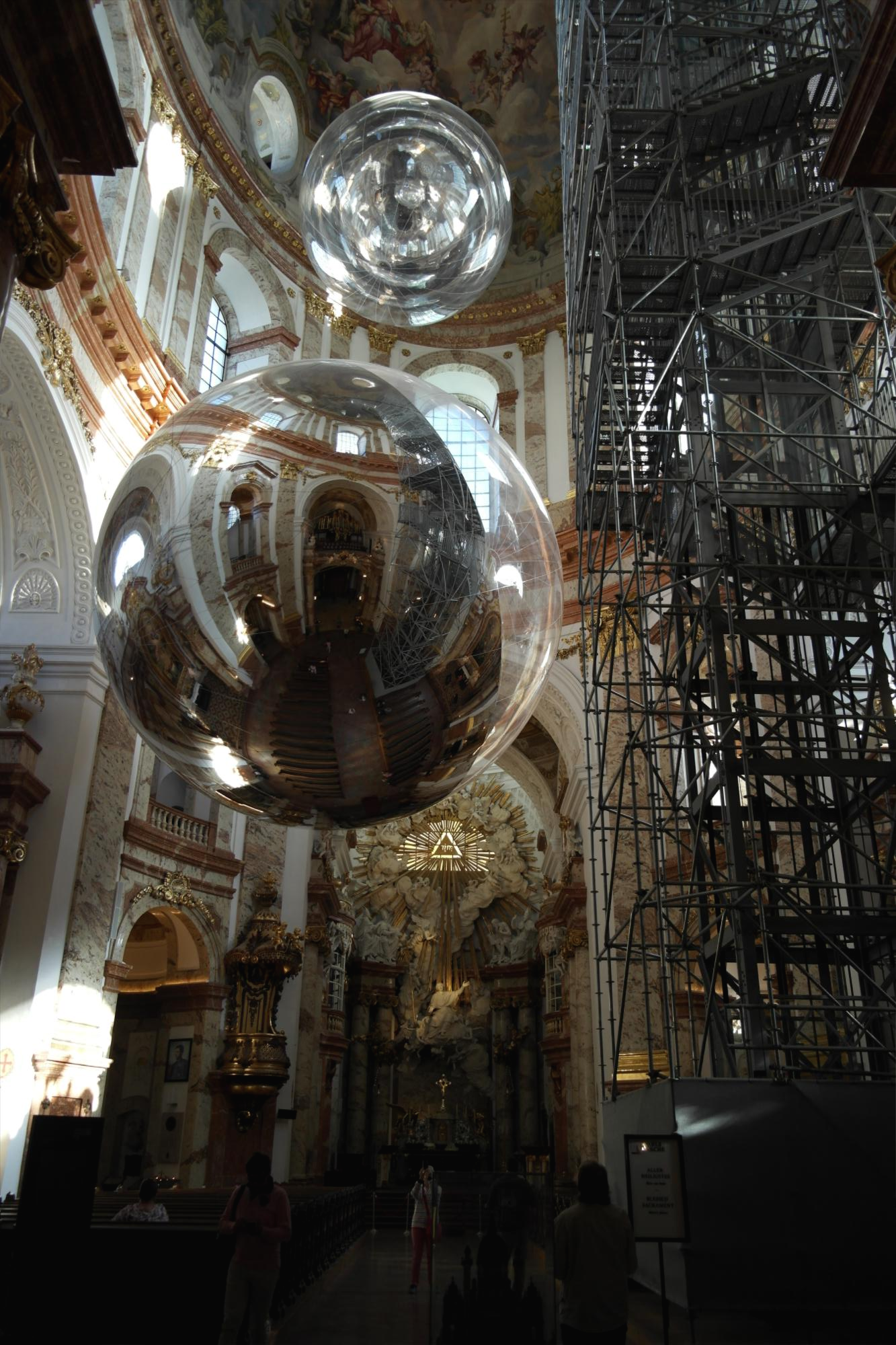교회에 들어서면 이렇게 묘한 광경을 만나게 된다. 교회 예배당 천정 한가운데에 구형의 반사 거울이 달려 있다. 그리고 오른편으로 교회 꼭대기까이 오르내리는 엘리베이터 시설이 있다. 이 엘리베이터를 타고 오르면 높은 곳에서 빈 시내를 조망할 수 있을 뿐만 아니라 카를 교회의 천정 장식들도 자세히 살펴 볼 수 있다. 교회에 입장하기 위해서는 입장료를 내야 한다.