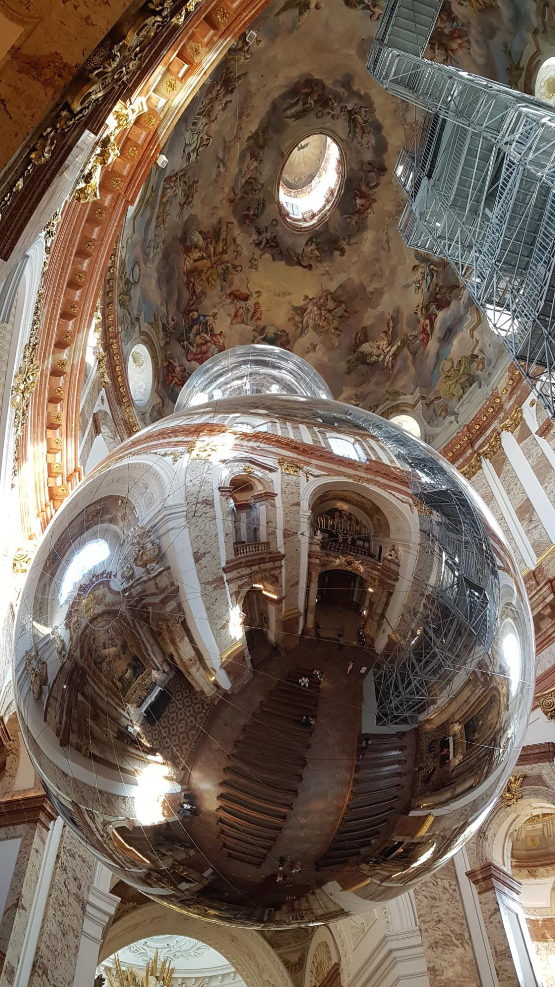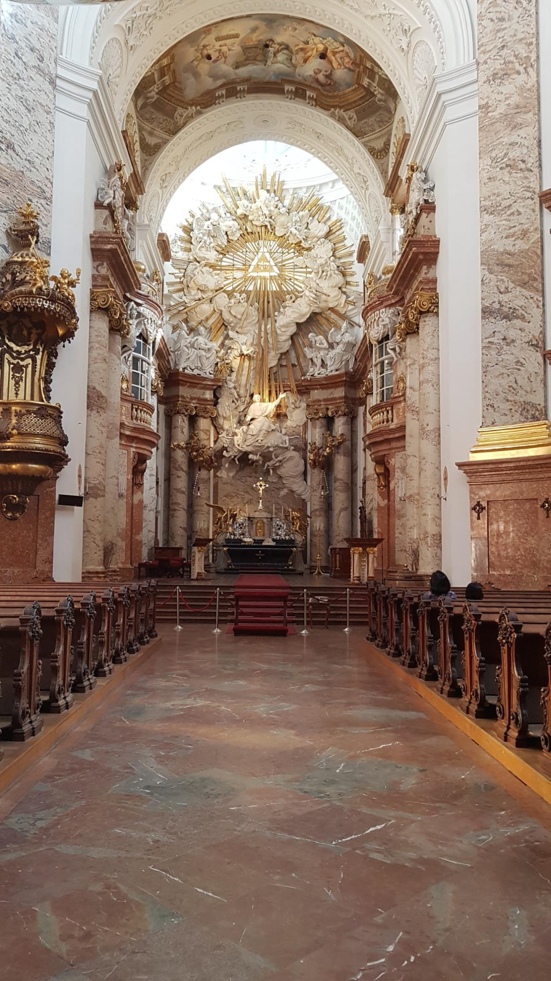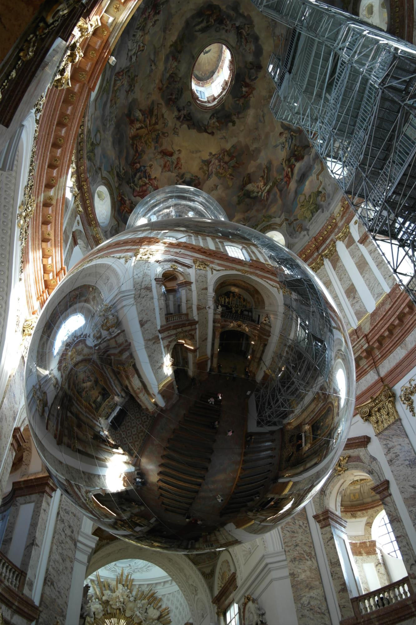 교회에 들어서면 이렇게 묘한 광경을 만나게 된다. 교회 예배당 천정 한가운데에 구형의 반사 거울이 달려 있다. 그리고 오른편으로 교회 꼭대기까이 오르내리는 엘리베이터 시설이 있다. 이 엘리베이터를 타고 오르면 높은 곳에서 빈 시내를 조망할 수 있을 뿐만 아니라 카를 교회의 천정 장식들도 자세히 살펴 볼 수 있다. 교회에 입장하기 위해서는 입장료를 내야 한다.