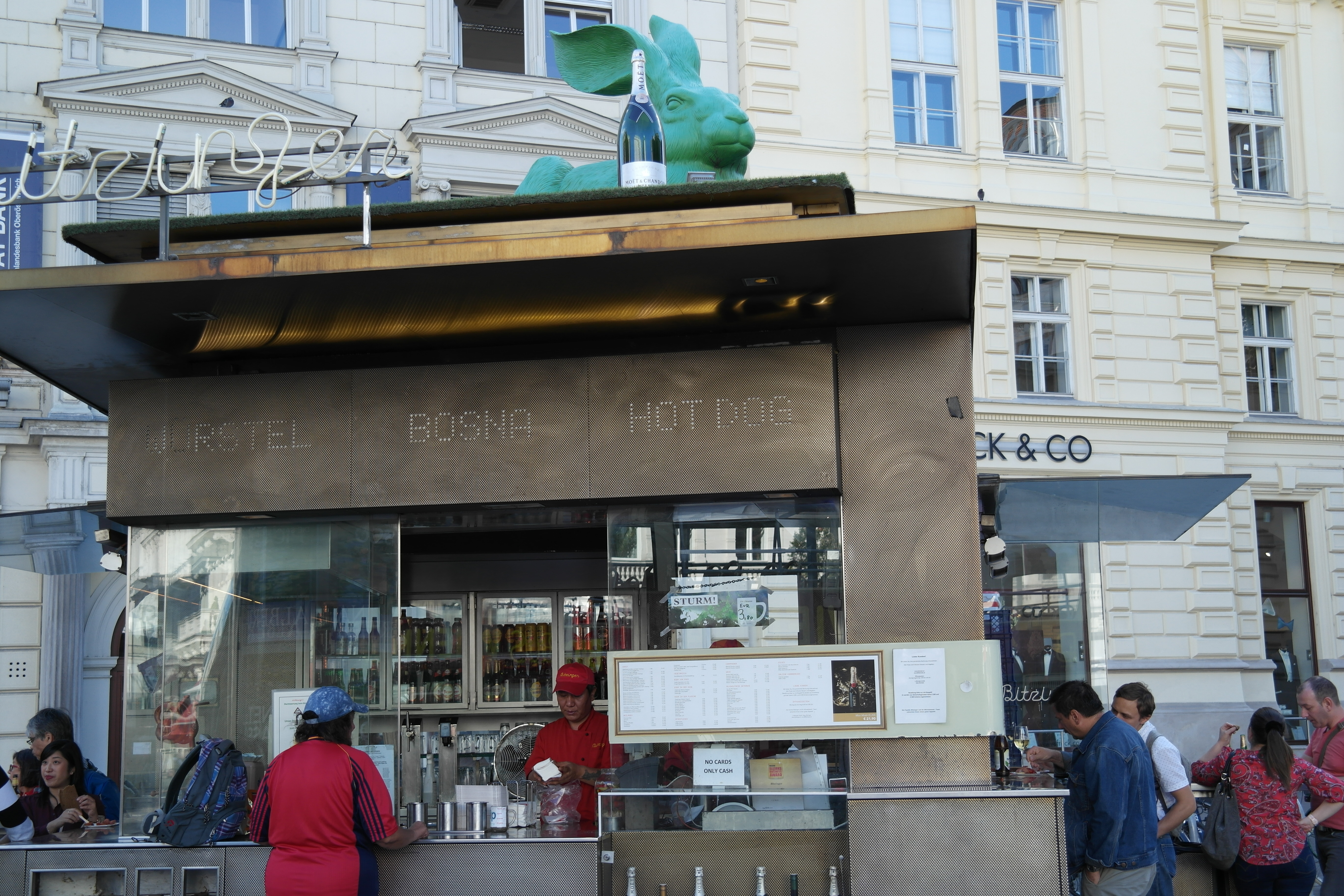 그 앞의 노점 위의 포도주 마시는 토끼상.