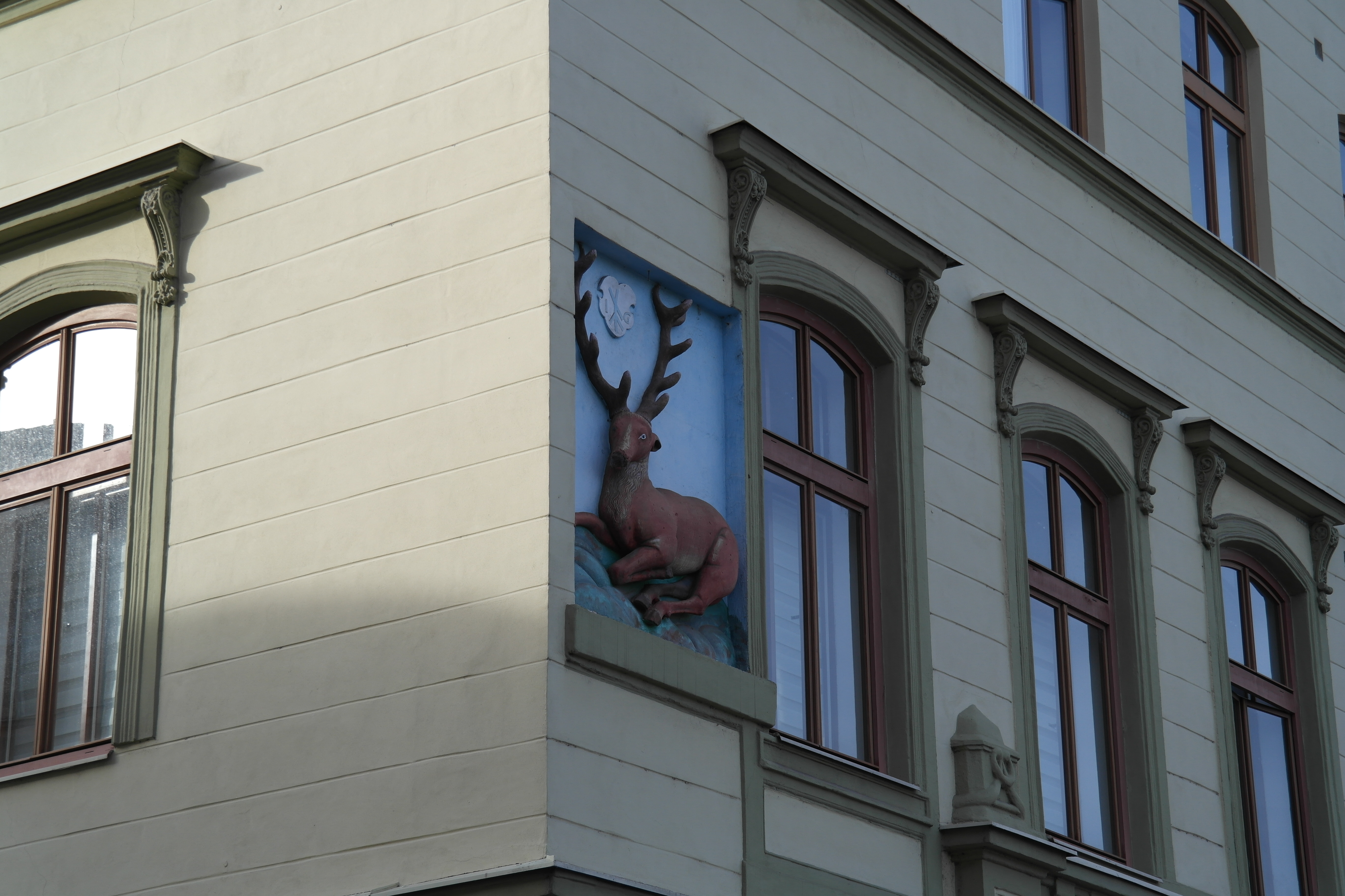 건물 벽 중간에 사슴 조각을 붙여 놨다.