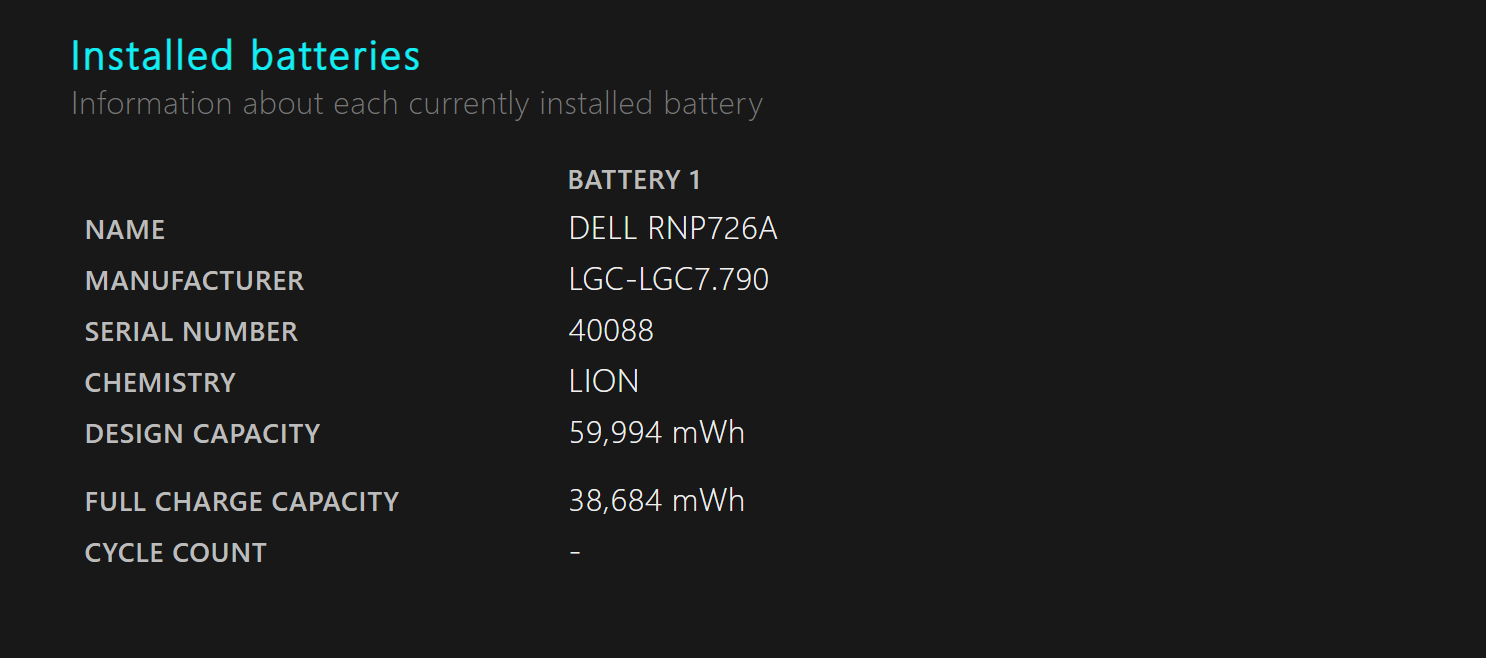 위 보고서를 보면 원래 만충량은 59,994mWh인데 이제는 만충해도 38,684mWh 밖에 안된다. 대략 원래 배터리 용량의 64%밖에 충전을 못하고 있는 셈. AS를 받거나 아니면 직접 배터리를 교환할 시점이 됐다는 의미다.