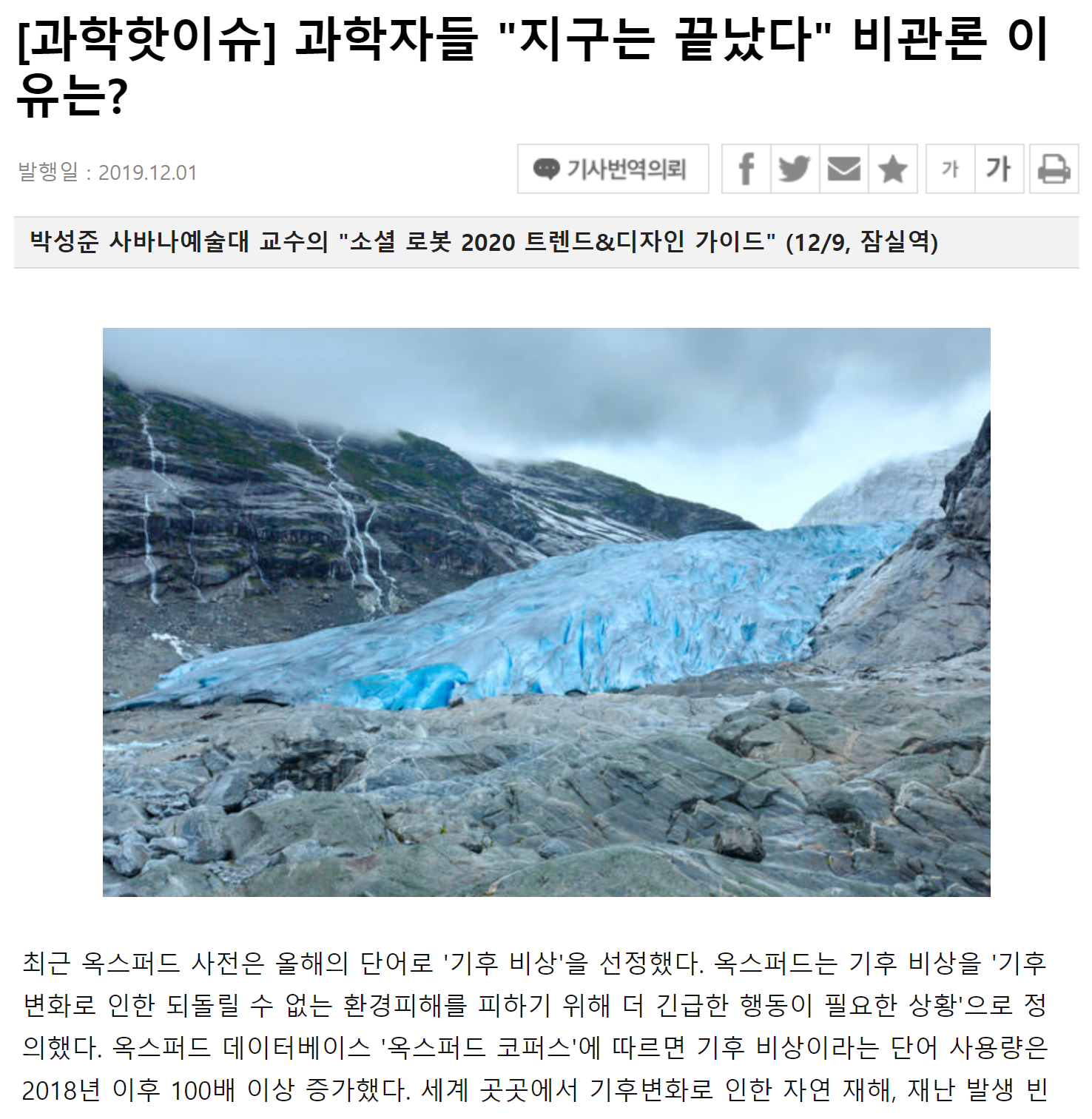 지난 50년 간 과거 빙하의 33%가 없어졌다. 기간을 좁혀 보면 최근 20년 동안에만 옛 빙하의 20%가 녹아내렸다. 빙하가 사라지는 속도가 급격히 빨라지고 있다는 뜻이다. 어쩌면 과학자들의 경고처럼 이제 여섯 번째 대멸종 시대에 접어든 것이 현실일지도 모를 일이다. 내가 할 수 있는 일은 다 해 봐야겠다고 마음먹지만 한구석에서는 어쩌면 다 부질없는 짓이 아닐까 절망스럽기도 하다. 잠 든 딸애 얼굴을 보며 여러 생각이 든다.