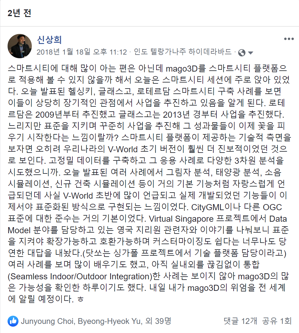 2년 전 오늘 Geospatial World Forum의 스마트시티 세션에 참가한 뒤 아래와 같은 소감을 남겼다.