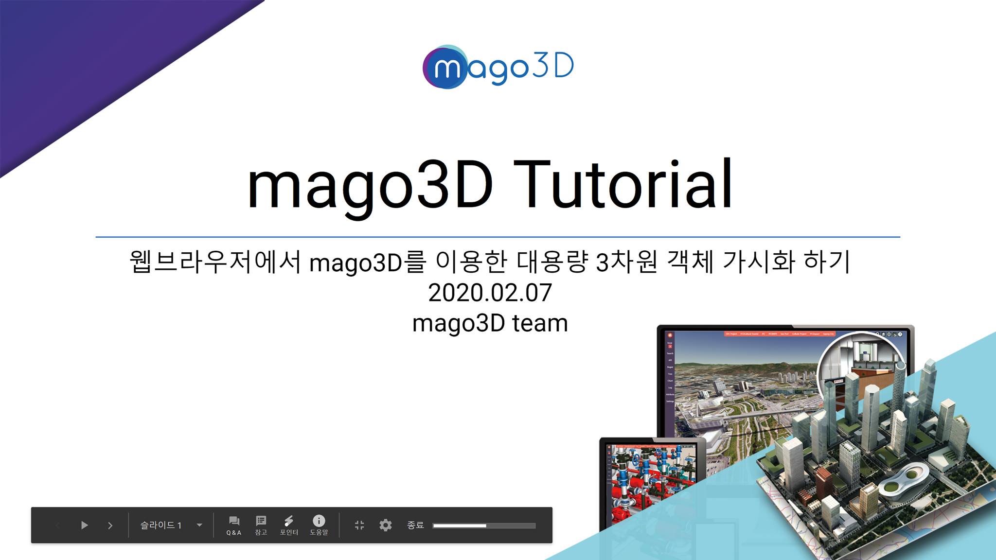 오픈소스 기반 디지털트윈 솔루션인 mago3D(www.mago3d.net)의 최신 교육자료가 나왔기에 여기 공유합니다. 자세한 사항은 아래 링크를 참고하시기 바랍니다.