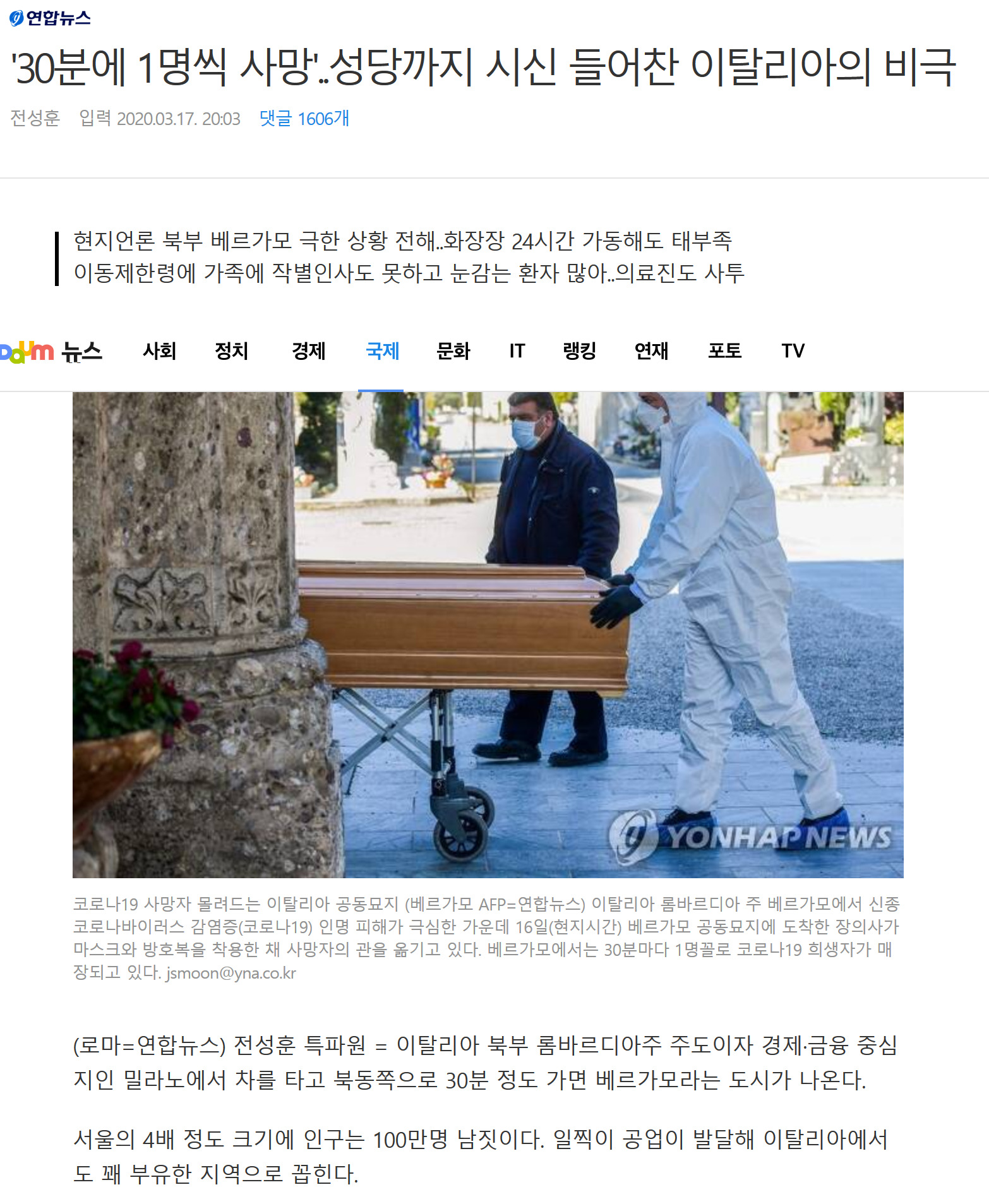 연합뉴스 로마 특파원이 작성한 위 기사를 보면, "밀라노에서 차를 타고 북동쪽으로 30분 정도 가면 베르가모라는 도시가 나온다. 서울의 4배 정도 크기에 인구는 100만명 남짓이다." 고 나옵니다. 이는 사실과 다릅니다. 이탈리아 베르가모는 인구 12만의 작은 도시입니다. 면적도 서울의 1/15에 불과합니다. 기자라면 가장 기본적인 팩트부터 확인하고 기사를 썼으면 합니다.