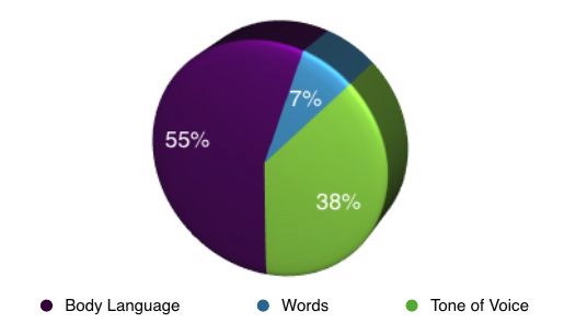 오래된 연구이긴 한데 UCLA 심리학과 앨버트 메라비언 교수에 따르면 대면 커뮤니케이션에서 상대방의 호감이나 인상을 결정짓는 핵심 요인은 말의 내용이 아니라 비언어적 이미지다. 자신감 있는 몸짓이 55%(표정이 35%, 태도가 20%), 목소리가 38%의 영향을 미치지만 말의 내용은 고작 7% 정도의 영향을 준다.