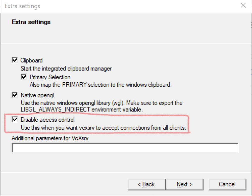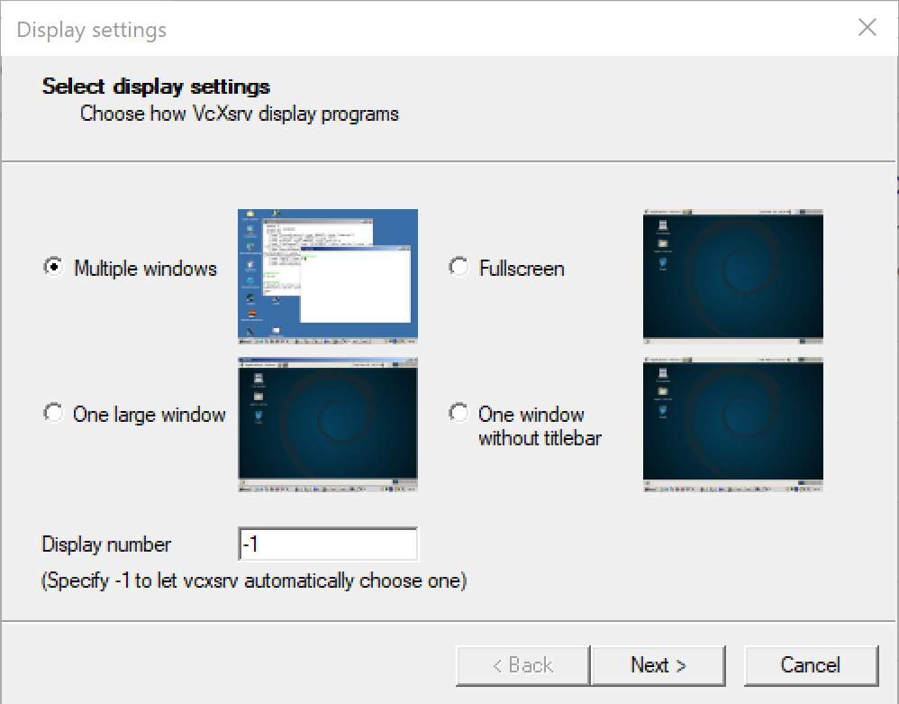 - VcXsrv를 실행한다. (개인적으로는 아래처럼 Multiple windows를 선호한다.) 더불어, 위에서 언급한 것처럼 [Extra Settings] 창에서 'Disable Access Control' 옵션을 꼭 체크해 줘야 한다