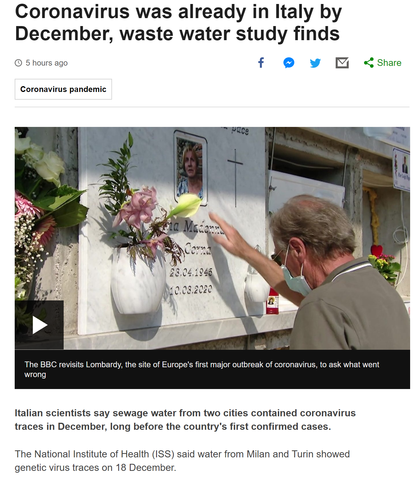 이탈리아 하수 샘플 검사를 해보니 코로나 바이러스가 이미 작년 12월에 이탈리아 북부에 상륙해 있었다고. 이탈리아 지역감염 첫 환자가 발견되기 거의 2달 전임. 이는 작년 12월 체취된 프랑스 폐렴 환자의 검체에서 코로나 바이러스가 검출된 것이나, 올 1월 중순의 스페인 바르셀로나 하수에서 바이러스가 검출된 것과 나란한 결과. 즉, 유럽에서 코로나가 본격적으로 확산되기 훨씬 전에 이미 유럽에 바이러스가 도달해 있었던 것. 유럽도 이런데 중국과 인적, 물적 교류가 훨씬 많은 한국에도 어쩌면 작년 12월 경부터는 바이러스가 유입되어 있지 않았을까 싶기도 함. 특히 대구 신천지 사태 때 그 연결고리를 끝내 차지 못 한 걸로 기억하는데 어쩌면 우리 생각보다 훨씬 전에 이미 이 땅에 코로나 바이러스가 와 있었을 수도 있음.