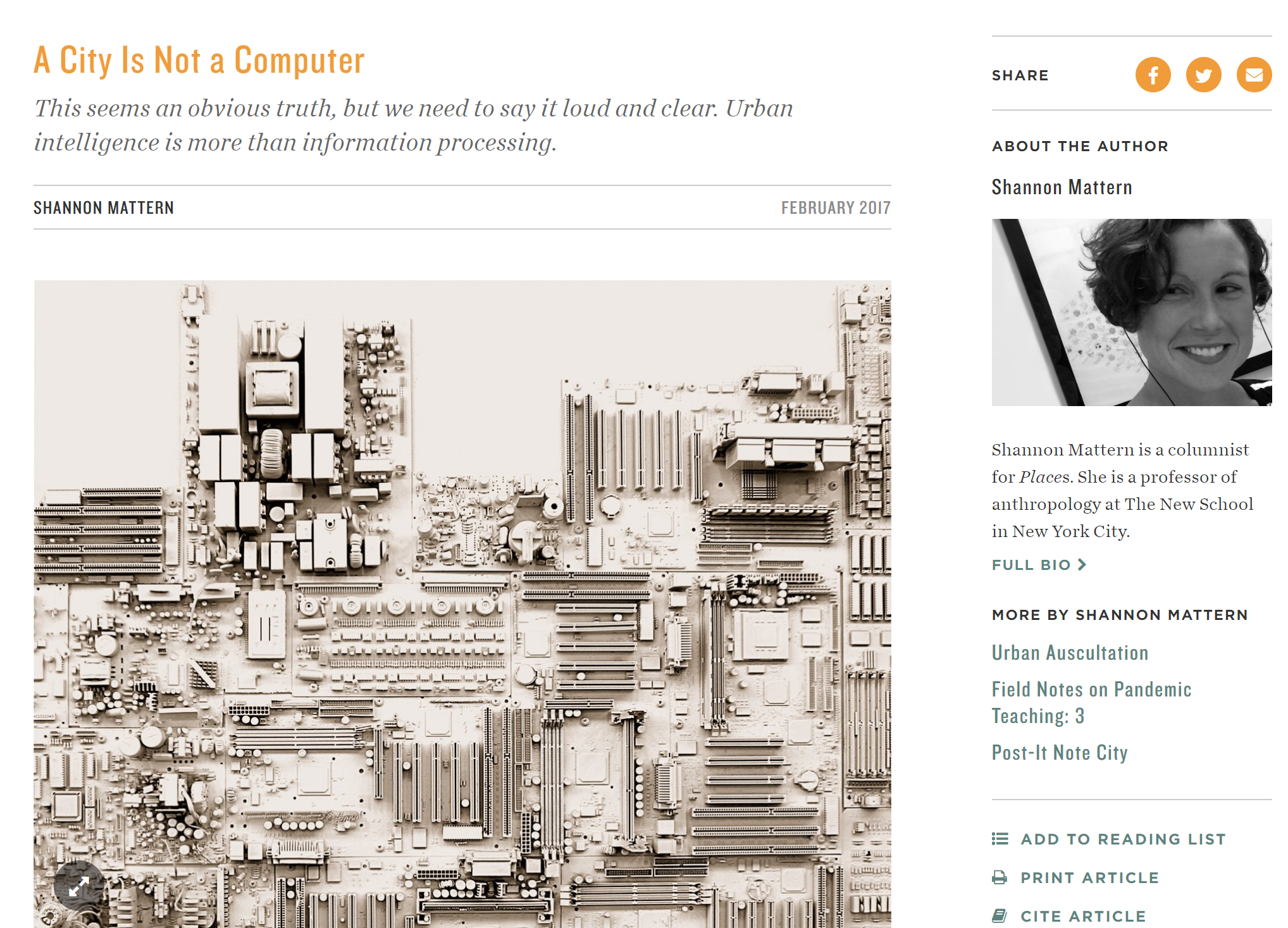스마트시티는 일반적으로 '도시'보다는 '스마트'를 더 강조한다. 스마트시티에서 도시란 거대한 데이터 생산공장이다. 도시 내 여러 활동과 상태는 각종 센서를 통해 모니터링되고 계량화되어 컴퓨터를 통해 빠르게 분석된다. 이제 우리는 도시의 많은 문제를 데이터 분석과 시뮬레이션으로 해결할 수 있다는 믿음을 가지게 되었다. 실제로 스마트시티에서는 예외 없이 빅데이터 분석을 통해 도시를 더 효율적이고 최적화된 방식으로 관리하며 주민의 '삶의 질'을 개선하려 노력한다. 다만, 삶의 질에 큰 영향을 끼치지만 계량화하기 어려운 공동체 의식, 소속감, 정주의식, 안정적 주거 등에 대해서는 애써 외면한다.