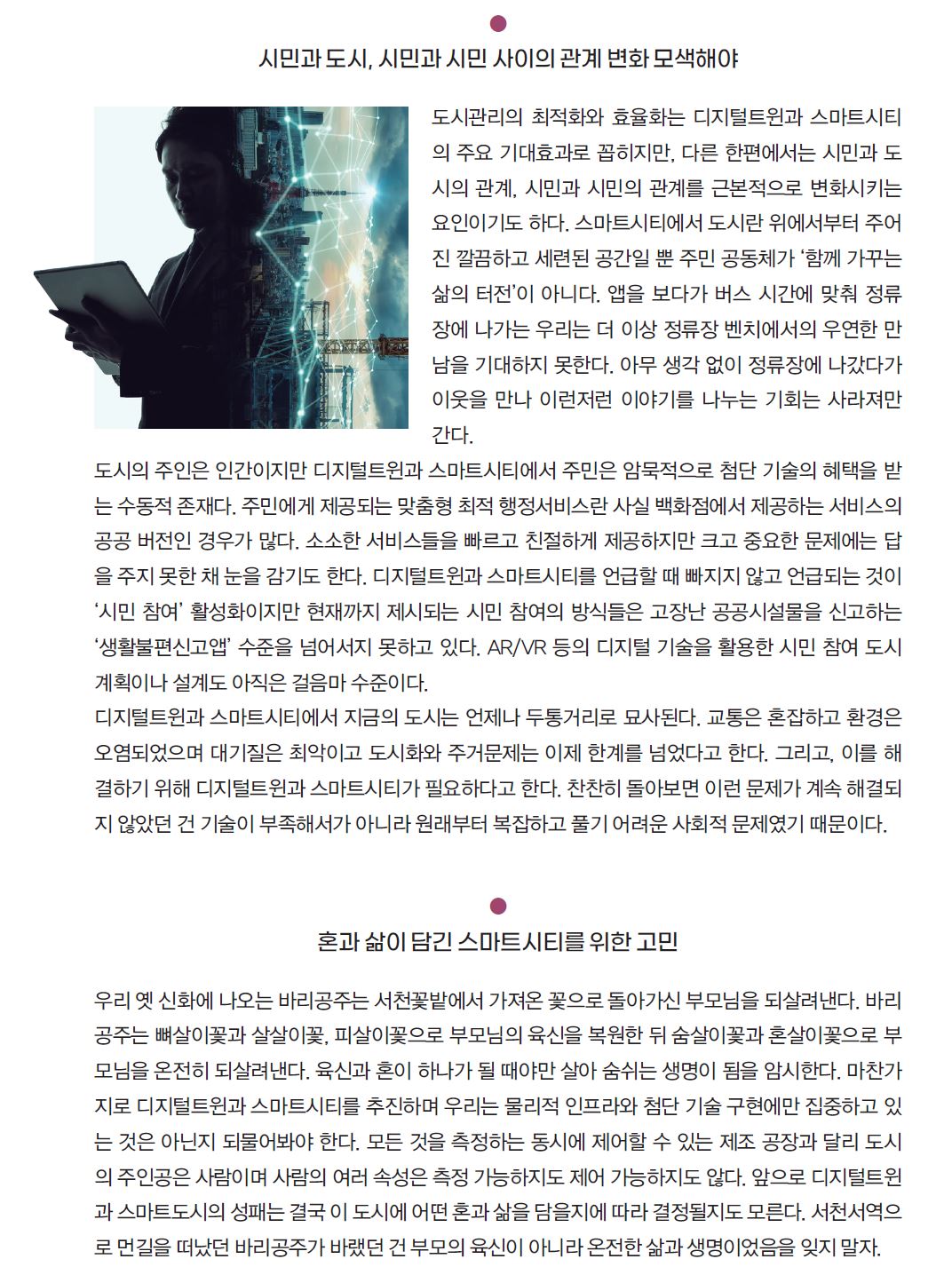 LX공간정보연구원이 발행하는 계간 [공간정보 매거진] 2020년 겨울호에 실린 제 글입니다. 디지털트윈이나 스마트시티가 영혼 없는 육체가 되지 않기를 바라는 맘을 담았습니다. 여기저기 끄적거려 놓은 걸 그러모아 특별한 내용은 없습니다. 참고하시기 바랍니다. 원 글은 endofcap.tistory.com/1939 에서 확인하실 수 있습니다.