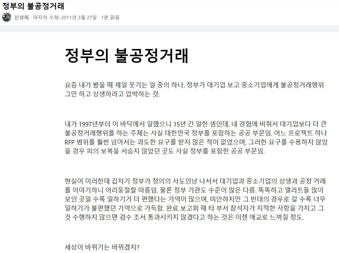 10년 전 이런 글을 남겼는데 상황이 조금 나아지기는 했지만 큰 틀에서 바뀐 건 없어 보인다. RFP의 내용은 요구사항분석이라는 과정에서 끝없이 확장되며 중간중간 윗분들에게 보여주기 위한 이벤트성 쇼는 본래 개발 내용보다 더 중요하게 다뤄진다. 개발 과정에서 초과 지출되는 업체의 인력과 자원은 의심의 여지없이 프로젝트의 일부로 당연하게 여겨진다. 복잡하고 험난한 과정을 거쳐 개발의 종착점에 다다르면 이제 고객은 업체의 초과 지출이나 현실과 맞지 않는 RFP는 아랑곳하지 않고 그저 RFP 자구 하나하나의 완료 여부를 따지기 시작한다. 소프트웨어 하나 만든 뒤 중복성 방지라는 명목으로 여러 기관이 돌려쓰거나 여기저기 확산시키는 건 정부나 공공기관의 오랜 관행 중 하나다. 그러면서 한켠에서는 한국 소프트웨어산업 발전을 위한 의견 수렴과 제도적 보완이라는 형식적 수레가 건조하게 돌아간다. 희망이 있을까? 10년 전 바램처럼 바뀌기는 바뀔까? 요새 고민하는 주제다.