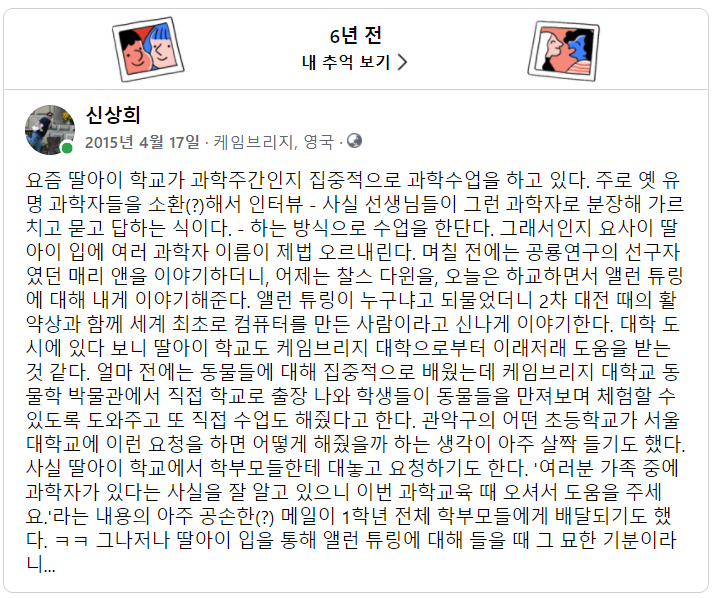 교육과 가르침이 꼭 선생님과 학교만의 일일까 생각이 들 때가 많다. 지역사회와 학교가 함께 할 수 있는 재미나고 유익한 기회들이 많을 텐데 서로 눈치 보며 놓치는 느낌이랄까? 애 학교 학부모회를 보더라도 교수, 국책연구원 연구위원 등 만만치 않은 분들이 상당하던데 이런 분들의 전문성을 학교가 잘 활용하지 못한다는 느낌이 들곤 한다. 직업과 진로 교육 같은 것도 교과서처럼 딱딱한 이야기가 아니라 실제 현업에 계신 분들 모셔서 하면 좋겠다는 생각도 들고. 부족하지만 나도 이런저런 학교 행사에 기여하려고 노력 중이다. 얼마 전에는 6학년 졸업앨범선정위원회에 가서 의견을 개진하기도 했다. 딸아, 미안하다. 아빠는 네가 밀었던 디자인이 아닌 다른 안을 선택했단다. ㅋㅋ