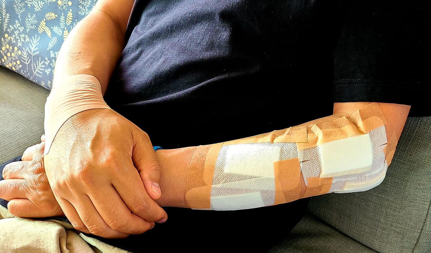 체인 빠지고 덜덜거리는 자전거 어찌어찌 고치며 점보택시를 부를까 하다가 자전거 타고 돌아올 수 있을 것 같아 그냥 저단 기어로 천천히 돌아왔습니다. 왼팔에서 피 나는데 계속 달리니 저절로 지혈되더군요. 한 15km 이렇게 달려 집에서 보니 벌써 딱쟁이가 내려앉았습니다. 샤워하고 소독하고 팔에는 대형 거즈 붙이고 갈비에는 대형 파스 붙이고 그랬습니다. 왼쪽 팔보다는 시큰거리는 갈비뼈가 살짝 걱정되기는 하네요.