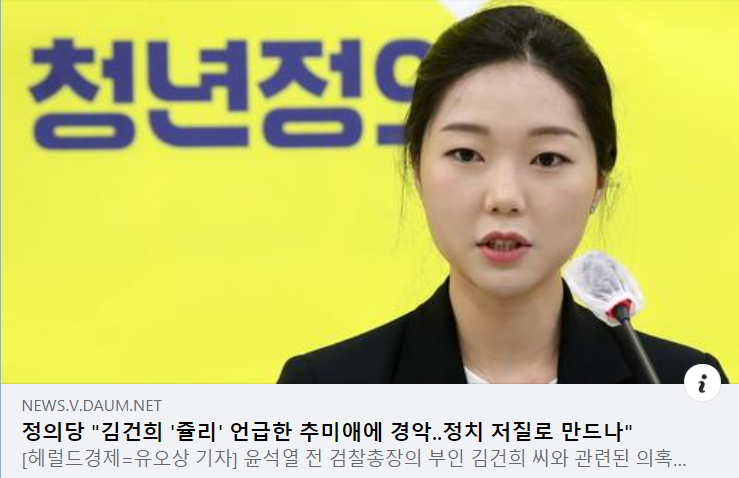[헤럴드경제=유오상 기자] 윤석열 전 검찰총장의 부인 김건희 씨와 관련된 의혹을 공개적으로 언급한 추미애 전 법무부 장관에 대해 강민진 청년정의당 대표가 “이렇게까지 정치를 저질로 만