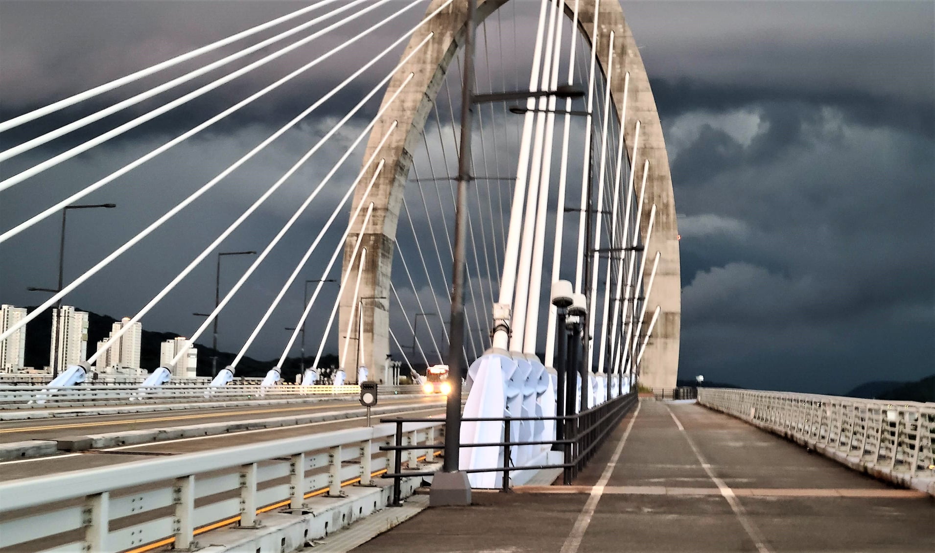 출발하고 조금 지나서 아내한테 전화가 오더니 세종에 강한비가 예상된다고 빨리 들어오라고 하더라구요. 하늘을 보니 조금 구름이 몰려오고 있기는 한데 그닥 비 올 것 같지도 않고 요즘 기상청 예보도 틀려서 그냥 조금만 더 가야지 하고 학나래교를 건너 강북으로 갔거든요. 학나래교 건너서 남쪽 하늘을 보니 짙은 뇌운이 남쪽에서부터 몰려오고 있더군요. X됐다 싶어서 열심히 밟아 한두리교를 넘어 남쪽으로 내려오니 비가 한두 방울 떨어지기 시작하는데 조금만 더 기다려줘를 외쳤으나 그 한두 방울이 바로 그냥 폭우가 되어 온몸으로 쏟아져내렸습니다.