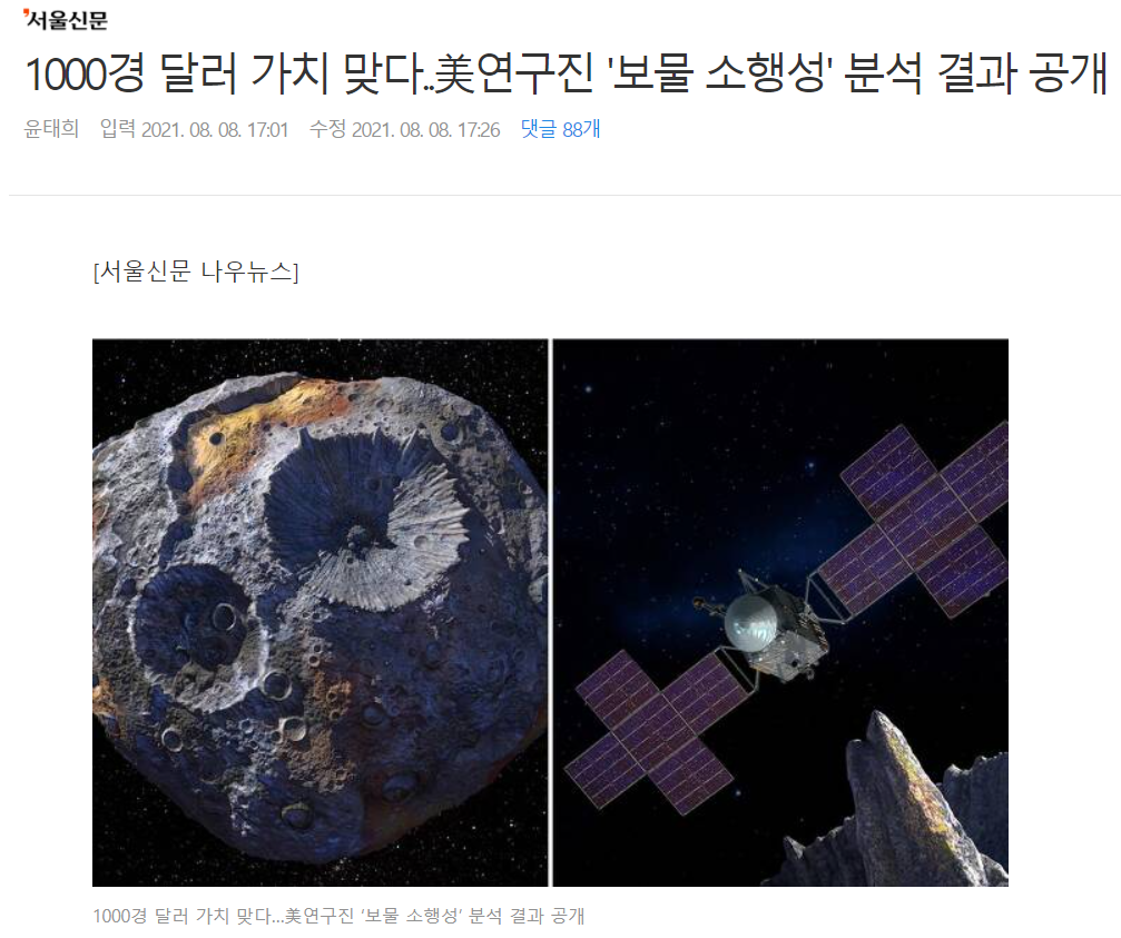 이런 소행성에서 자원 채굴해 지구로 가져오겠다는 스타트업 있음. 상업적 성공 가능 년도를 50년 뒤로 보고 사업 준비하는데 놀랍게도 투자자들이 넘쳐서 더 이상 투자 안 받는다고. 참고로 이미 작년 12월에 일본 탐사선 하야부사 2호가 소행성 류구에서 토양을 채취해 지구로 가져온 적 있음.