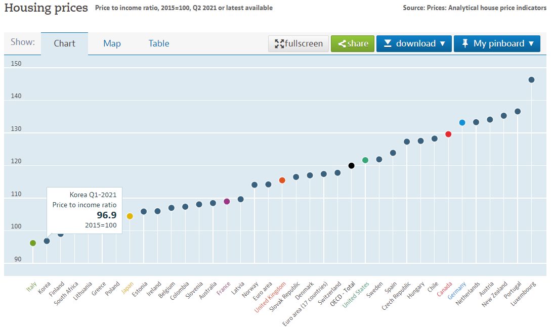 심심해서 찾아 본 한국 집값 수준(PIR - 소득 대비 집값 지수, OECD 통계) 집값 미친 듯이 올랐다고 다들 생각하지만 최소한 OECD 수준에서는 낮은 수준이고, 2015년의 PIR과 비교하자면 집값은 오히려 하락한 수준. 캐나다 집값이 미쳤다는 BBC 뉴스 보다 찾아 봄. https://data.oecd.org/price/housing-prices.htm 에서 더 자세한 정보 볼 수 있음.