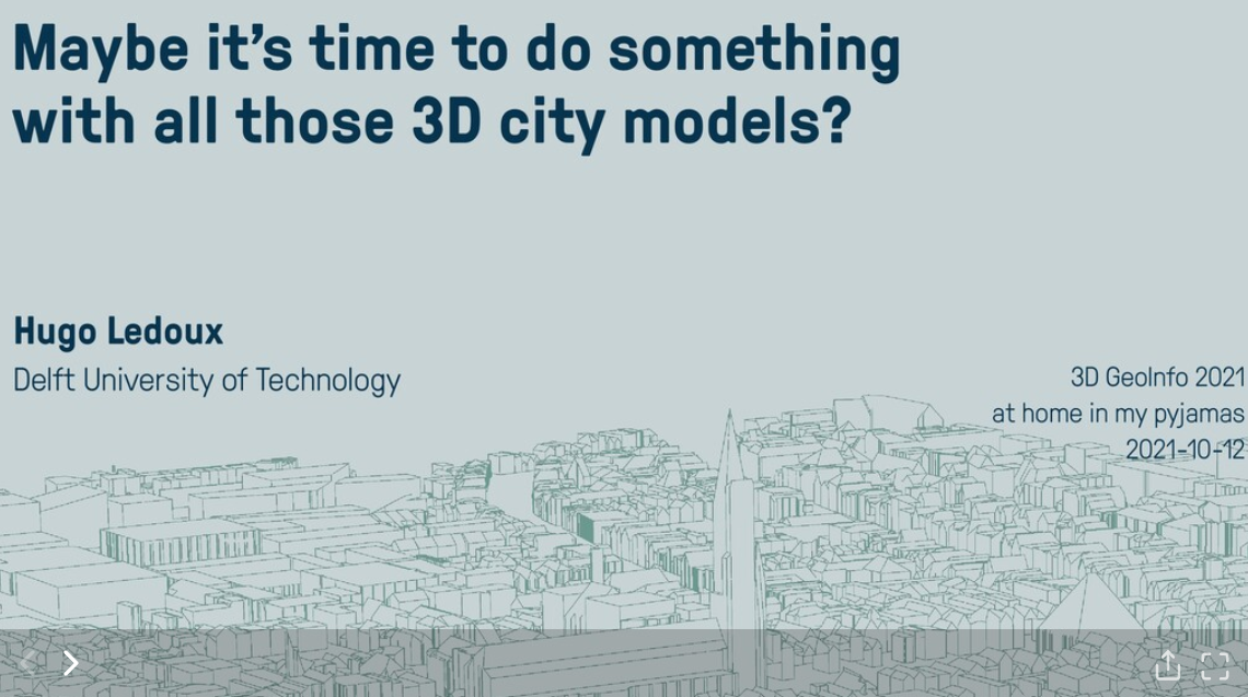 발표 동영상은, https://www.youtube.com/watch?v=EGf3832F1B0 에 있고 발표 슬라이드는, https://speakerdeck.com/hugoledoux/maybe-its-time-to-do-something-with-all-those-3d-city-models 에 있습니다.