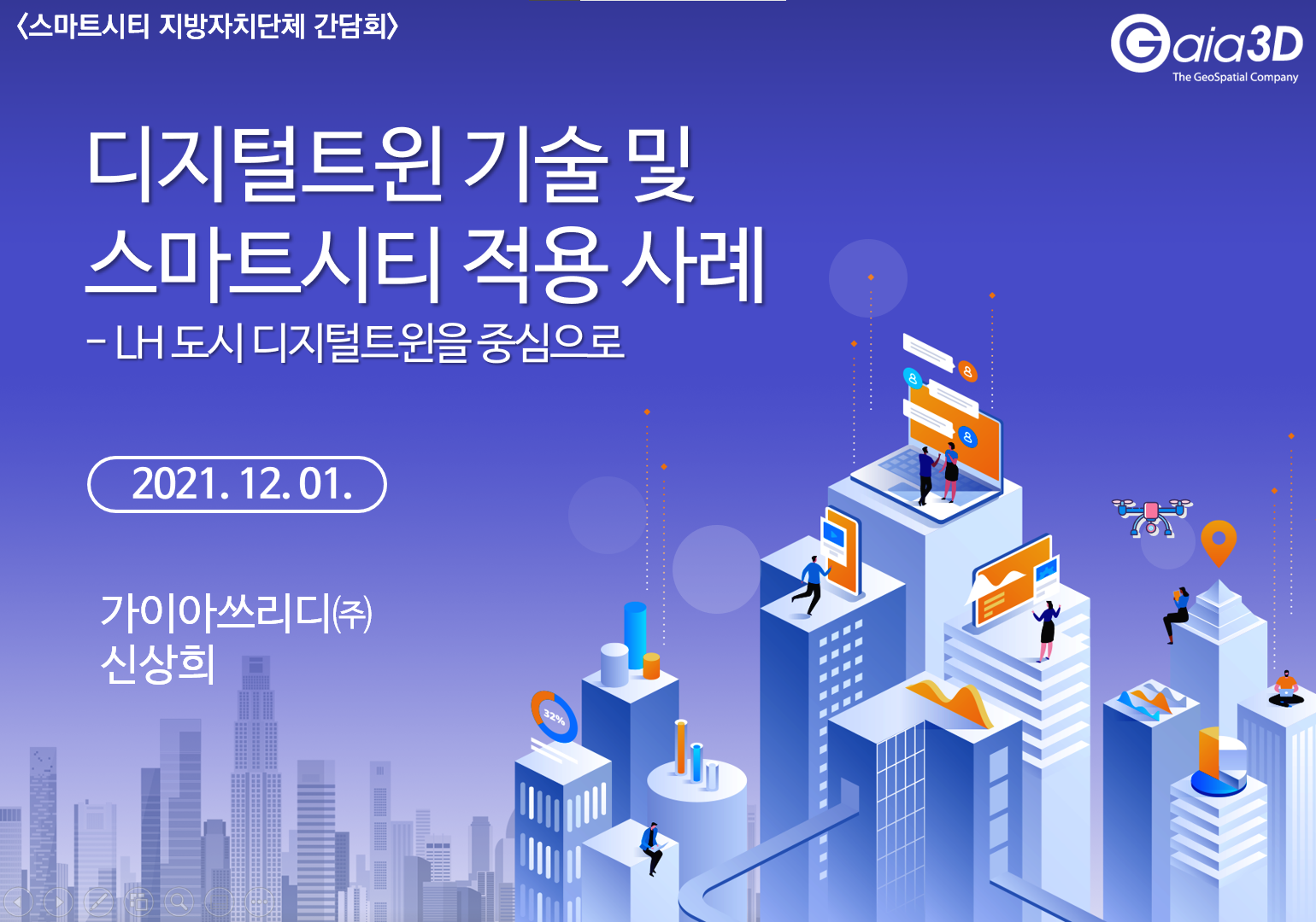2021년 12월 1일 오송 컨벤션센터에서 개최된 스마트시티 국토부-지자체 간담회에서 발표한 자료입니다. 가이아쓰리디가 현재 구축 중인 LH공사 도시 디지털트윈 기술을 중심으로 디지털트윈의 스마트시티 적용 사례를 소개했습니다. 참고하시기 바랍니다.