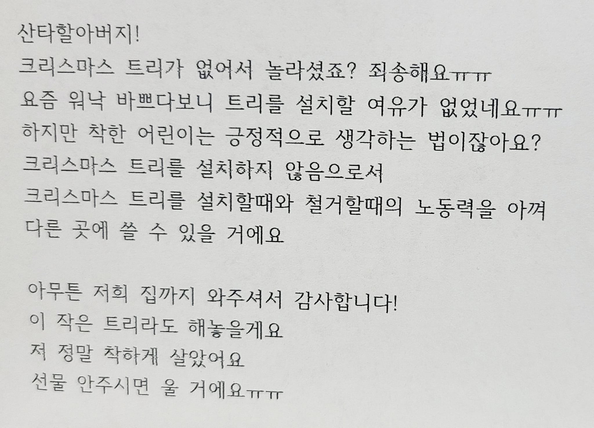 크리스마스 트리를 설치하기는 귀찮지만 산타 선물은 받고 싶은 한 소녀의 절절한 호소.