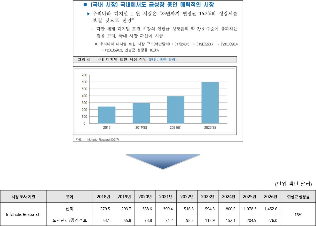 2. 위 논문에 따라 전 세계 디지털 트윈 시장 중 대략 19% 가량을 도시관리/공간정보 분야의 디지털 트윈으로 추정할 경우 한국시장을 아래와 같이 추정가능함.