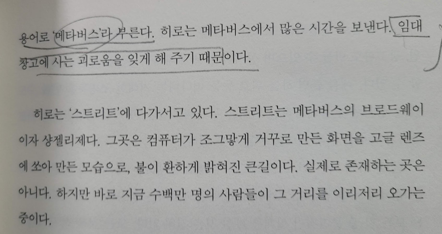 소설 스노크래시에 '메타버스'가 처음 언급됐다고 메타텍스트로는 자주 접했는데 그 문단을 제대로 언급한 경우는 거의 없어서 책을 사다 해당 메타버스 부분을 직접 찾아봤다. 소설에서 '메타버스'는 괴로움을 잊게 해주는 공간이다. 메타의 마크 주커버그가 직원들 시켜서 메타버스 개발해 놓고 자기는 알프스랑 하와이로 놀러가서 친구들이랑 스키 타고 수영하며 놀았던 이유를 알겠다.