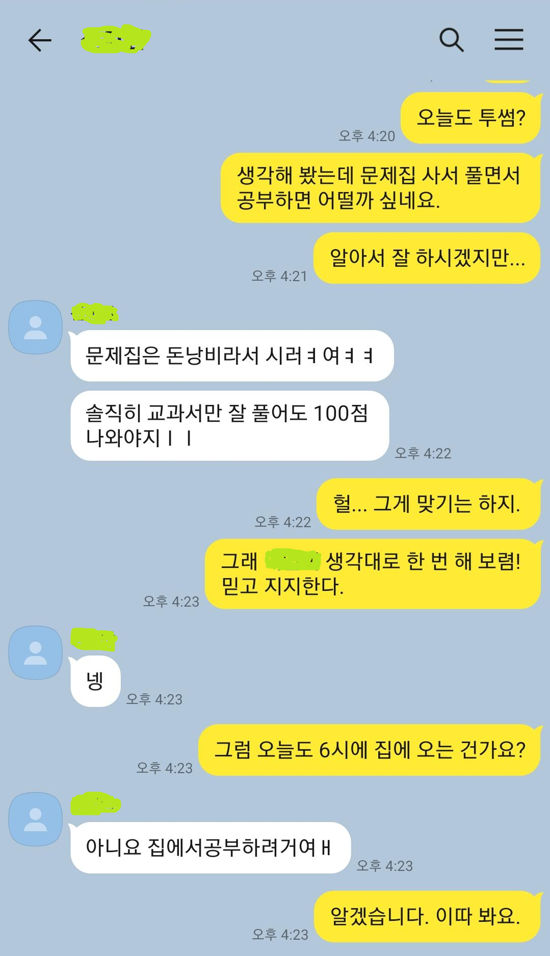 애는 내신에도 안 들어가는 것 빵점 맞으면 빵점이지 하며 짐짓 여유로움을 보이지만 돌아서서는 나름의 스트레스를 고백한다. 생각밖으로 심신이 피곤하다고. 학원도 안 다니는데 문제집 풀면서 공부하면 어떨까 제안해 봤지만 교과서만 열심히 준비하면 100점이 나와야 정상적인 교육이라며 거부한다.