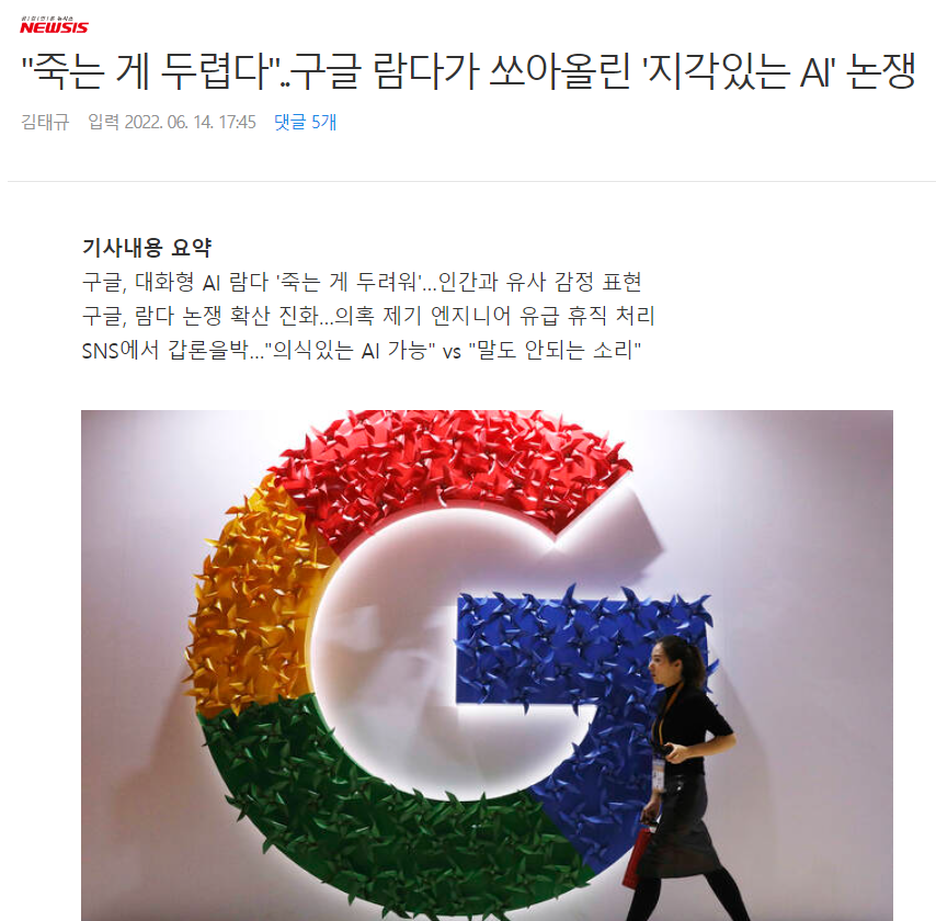 1. 요약하자면 구글에서 개발 중인 대화형 인공지능 람다가 '죽는 게 두렵다' 등 인간과 유사한 감정을 표현. 담당 엔지니어가 람다에 의식이 있는 것 같다는 보고서를 구글 경영진에 올렸으나 경영진이 이를 무시. 이에 람다와 나눈 대화 내용을 블로그나 트위터 등에 공개. 구글은 담당 엔지니어 휴직 처분하고 람다에 의식이 없다고 공식 발표.