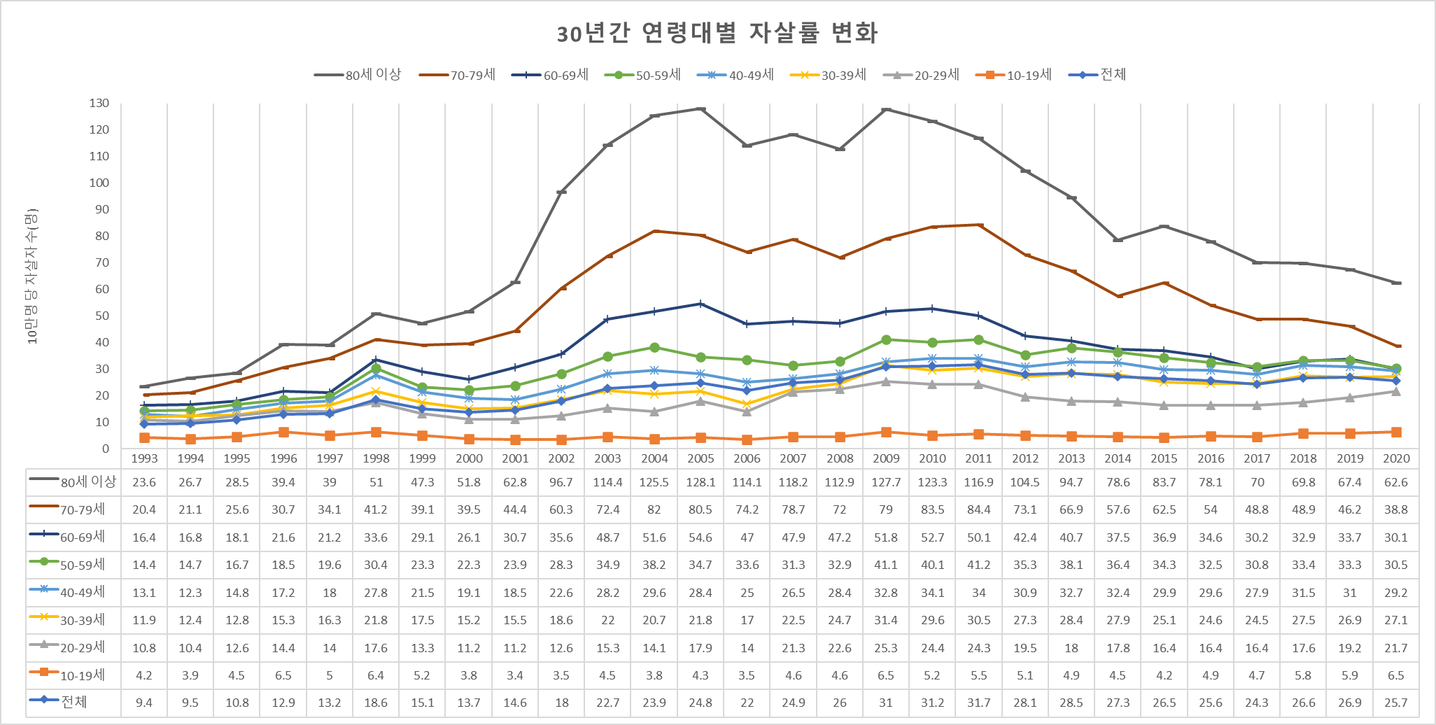 지난 30년 동안의 연령별 자살률 변화를 그래프로 아래와 같이 한 번 그려봤다. 1997년 IMF 외환위기 이후 급속히 상승한 자살률은 2009년~2011년 사이에 최정점을 찍은 뒤 2012년부터 전반적으로 조금씩 하락세를 보이고 있다. 특히, 60대 이상 노령층의 자살률 감소가 인상적이다. 2012년 이후 모든 연령대에서 자살률이 감소하지만 20대의 자살률은 꾸준히 증가하고 있는 점이 우려스럽다.