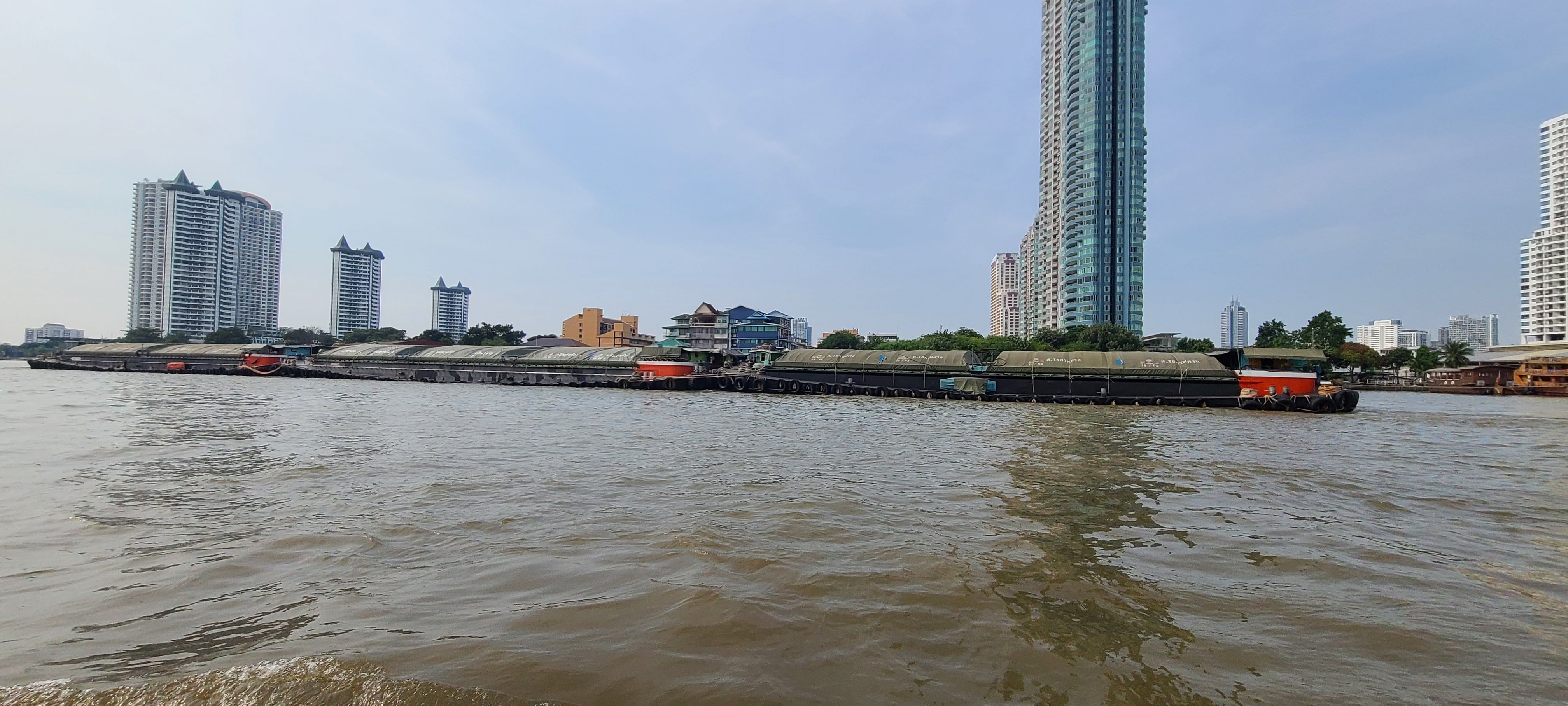 엄청난 양의 화물을 수송하는 차오프라야강의 화물선.