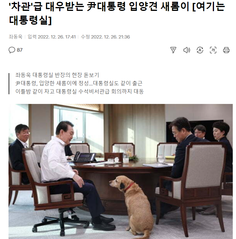 그리고 어쩌면 저 개도 보통 개가 아닐지도 모릅니다. 손에 왕자를 새기고 신체 특정 부위에 침을 놓음으로써 대통령까지 오르신 분인데 우리가 모르는 또 다른 영적인 세계, 그러니까 개의 영혼과 교감하고 있는 것일 수도 있는 거죠. 수석비서관이면 차관급인데 차관급 회의에 데려온 개라면 분명 보통 개는 아닐 겁니다.