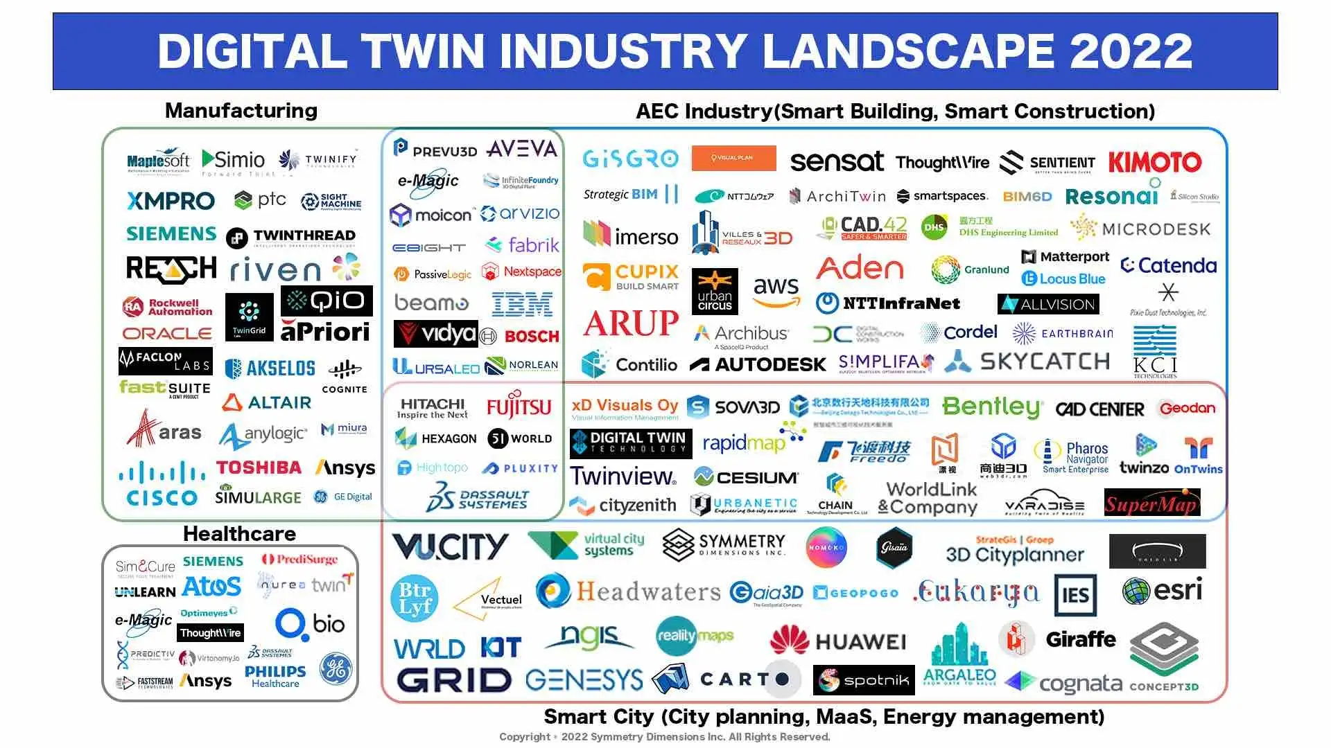 가이아쓰리디가 미국 Symmetry Dimensions가 선정한 2022년 세계 디지털트윈 일원으로 선정되었습니다. Symmetry Dimensions는 매년 세계 디지털트윈 생태계의 주요 회사를 선정해 발표하고 있는데요. 이번에 한국 회사로는 처음으로 가이아쓰리디가 스마트시티 분야의 디지털트윈 주요 회사로 선정되었습니다.