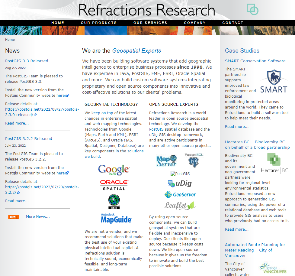 Refractions Research라는 회사를 아세요? 캐나다 밴쿠버에서 페리를 타고 2시간가량 남쪽으로 가면 빅토리아라는 아름다운 섬에 닿습니다. 이곳 시내에 이제 직원 10명이 안 되는 작은 공간정보 회사 Refractions Research가 있지요. 주로 캐나다 브리티시 컬럼비아 주 정부의 일을 도맡아 하고 있습니다.