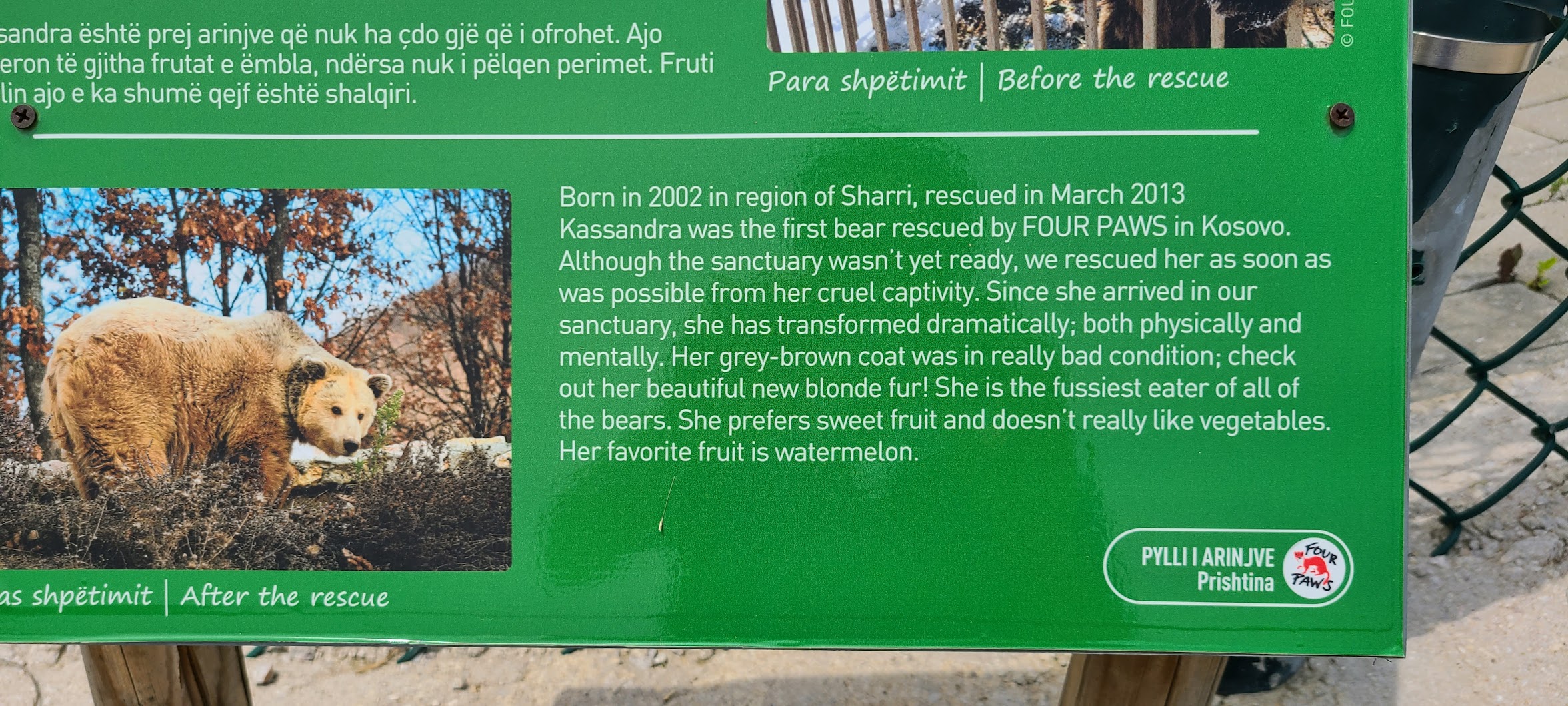 코소보에서는 예전에 곰이나 사자를 우리에 가둬두고 이를 손님에게 보여주며 영업하는 식당들이 제법 있었던 모양이다. 동물구호단체에서 이런 곰을 구출해서 보호하고 있는 곳이다. 다만, 이제는 이 시설 자체가 또 하나의 관광지가 되어버린 듯한 느낌을 받기도 했다.