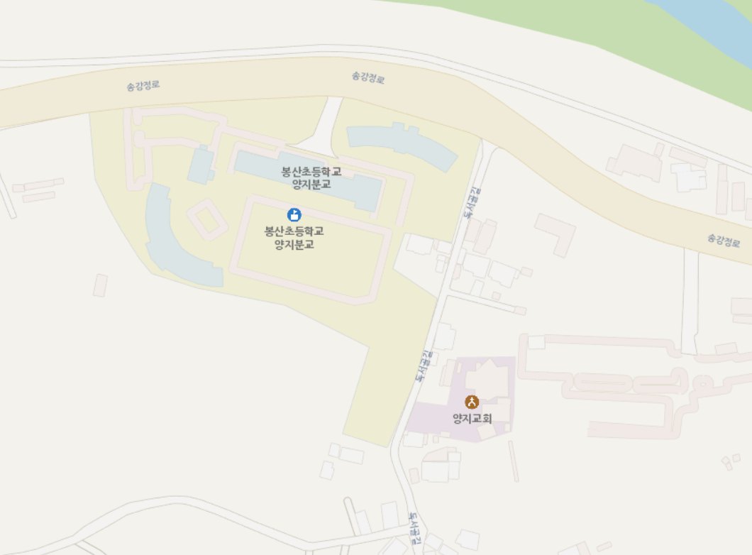 전라남도 담양군 고서면 송강정 서쪽 편에 있는 학교를 국토지리정보원 국토정보맵과 브이월드에서는 '봉산초등학교 양지분교'로 표기하고 있고, 네이버, 카카오맵과 티맵에서는 모두 '송강고등학교'라고 표기하고 있다. 지도 속 건물 모양과 배치도 조금씩 다르다.