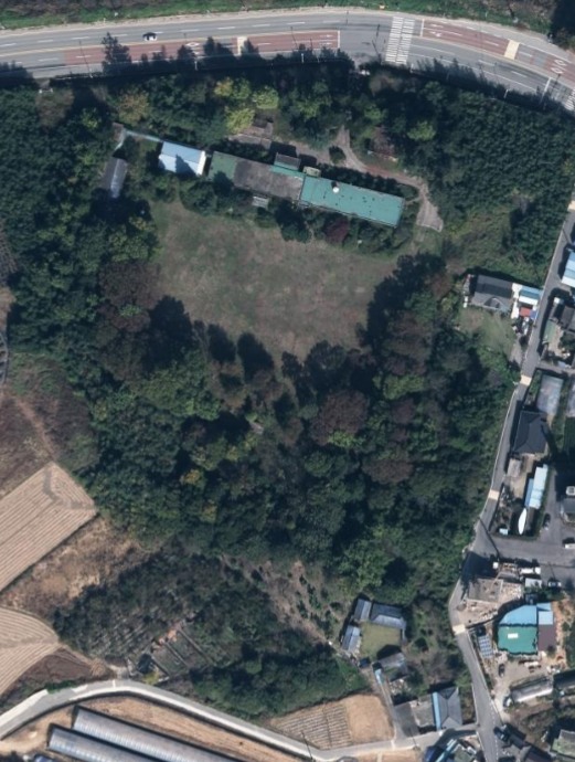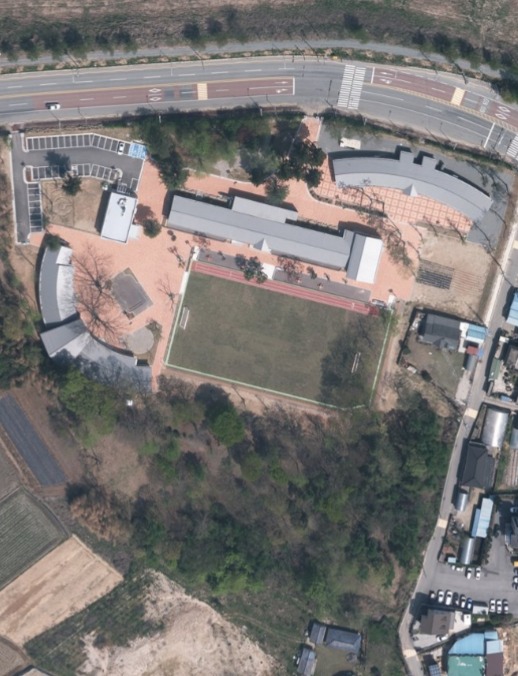 메타데이터를 보니 국토지리정보원의 지도는 2022년에 촬영되고 조사된 지도다. 국토지리정보원이 제공하는 항공영상으로 추적해 보니 2020년경부터 고등학교로 변경하기 위한 공사가 진행되었던 모양. 2019년 항공영상을 보면 현재 학교건물과 확연히 다르다. 2020년부터 대규모 신축과 증개축이 있었다.