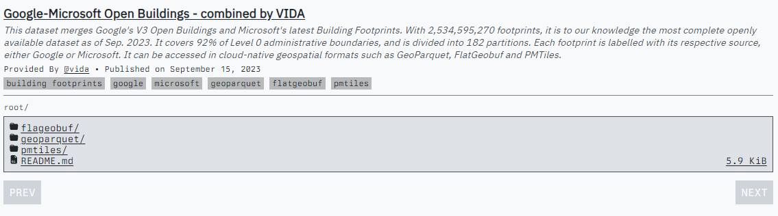 Google의 Open Buildings 데이터와 Microsoft의 Building Footprints 데이터를 통합한 전 세계 빌딩 데이터. 전 세계 총 25억 3천만 건의 빌딩 외곽선 데이터. GeoParquet, FlatGeobuf, PMTiles 포맷으로 제공.