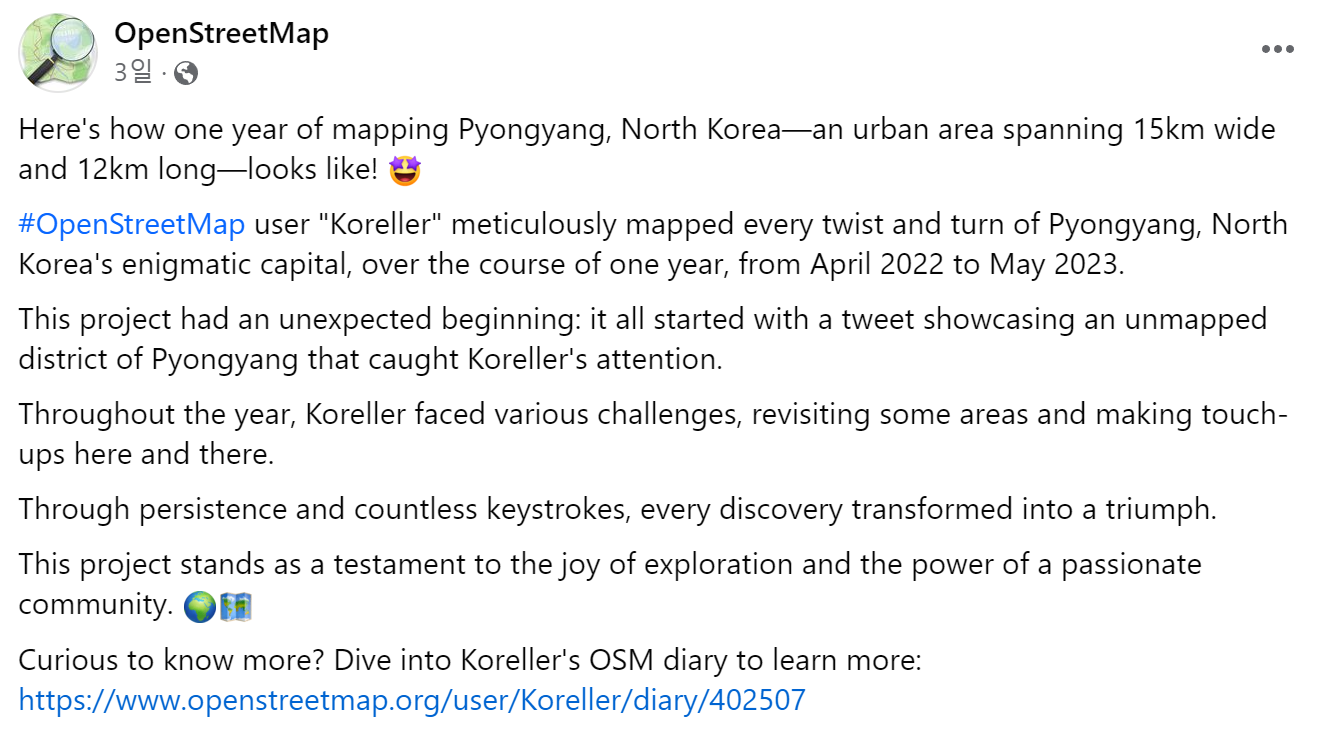 OpenStreetMap에서 북한 평양 중심가를 보면 서울보다 더 자세히 매핑되어 있거든요. 도대체 누가 했을까 했는데 프랑스 낭트에 사는 한 젊은이가 2022년부터 꾸준히 그린 거네요. OSM에서 평양 한 번 들어가 보세요. 정말 어마어마한 수준으로 매핑해 놨습니다. 우리나라 정부에서도 평양이나 북한 지도 만든다고 많은 예산을 쏟아부었는데요. 이렇게 다른 나라의 젊은이가 많은 기여를 하네요.