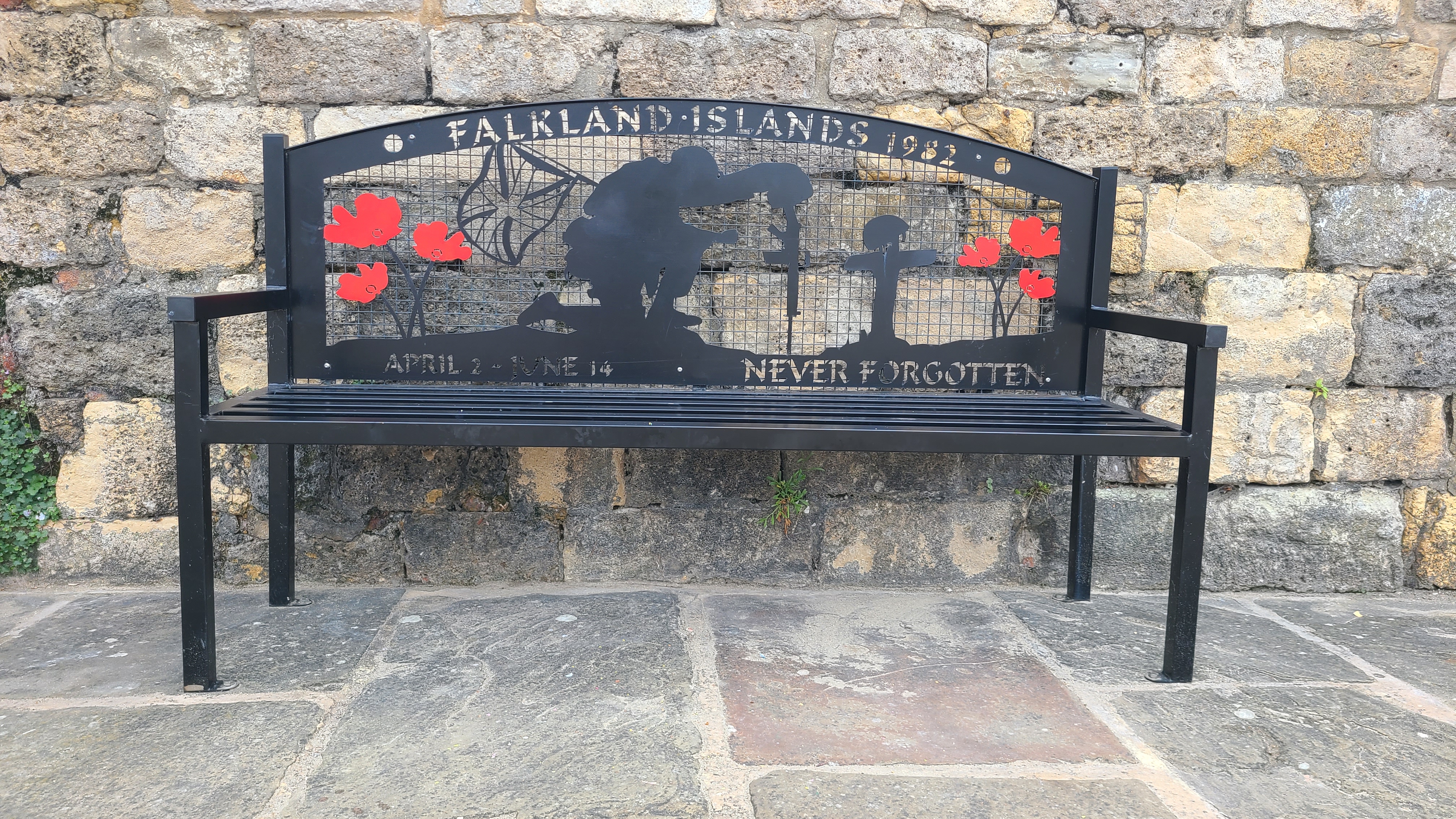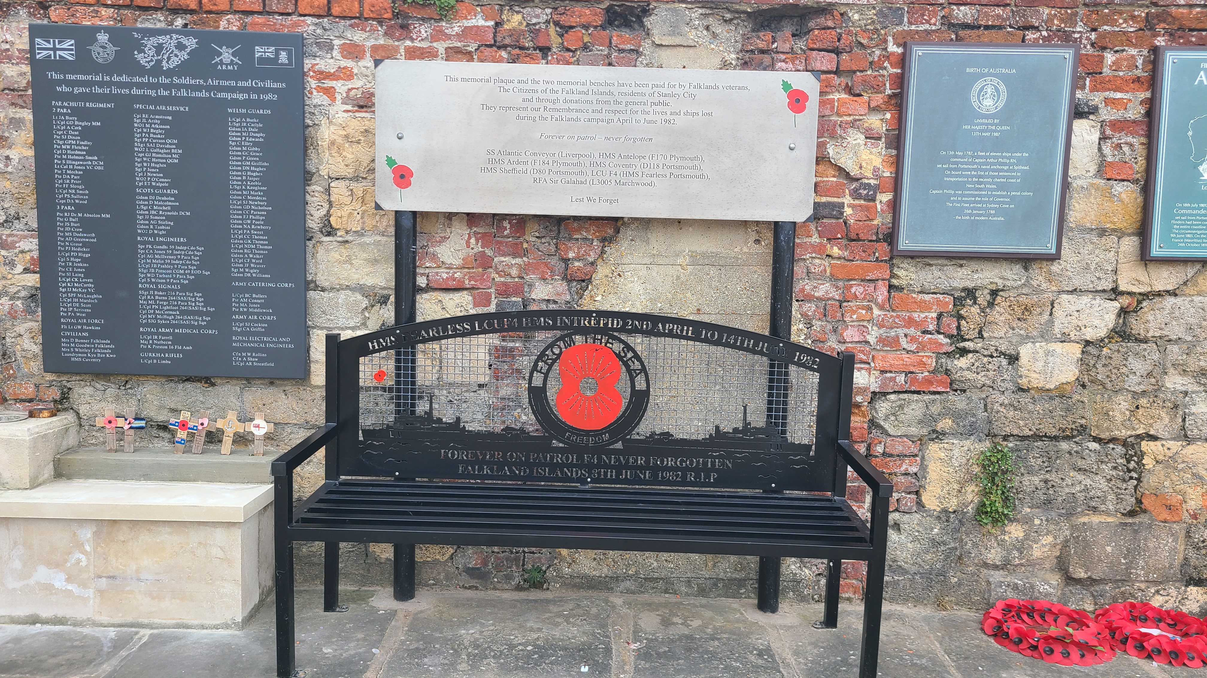 1982년 영국과 아르헨티나의 포클랜드 전쟁 때 이곳 포츠머스에서 영국 전함들이 포클랜드를 향해 떠났다. 포클랜드 전쟁에서 희생된 이를 기리는 의자와 전몰자 명단.