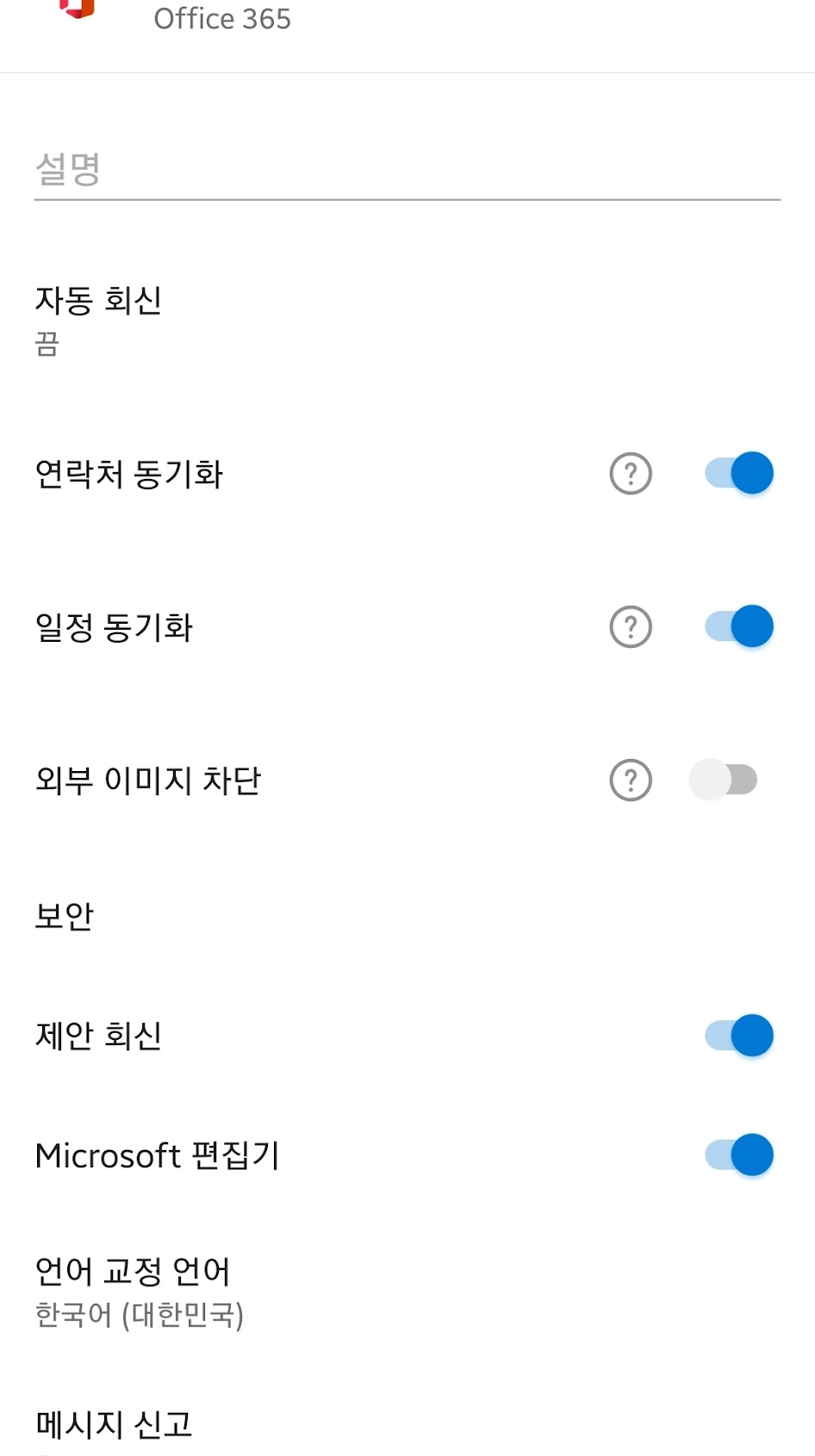 삼성 캘린더와 Outlook의 일정 동기화를 하려면 Outlook 앱에서 아래처럼 [일정 동기화]를 켜줘야 한다. 그러면 삼성 캘린더와 Outlook의 캘린더가 동기화 된다.