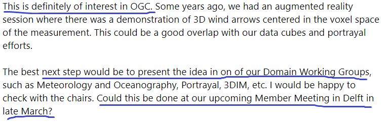 2차원 지도 서비스를 위해 우리는 타일맵서비스(TMS, WMTS)를 쓰거나 벡터타일(MVT, PMTiles)을 씁니다. 3차원 객체 서비스를 위해서는 3D Tiles 표준을 사용하지요. 그런데, 대기질, 바람장, 악취, 소음 등과 같이 3차원 공간에서 시간에 따라 변화하는 시공간 현상정보를 표출하기 위한 표준은 없는 상황입니다. 그래서, 공간정보 국제표준화기구인 OGC에 문의했더니 OGC가 당연히 관심을 가져야 할 사항이라며 3월 말 네델란드 델프트에서 개최되는 OGC 회의에 와서 발표해 달라는 답신이 왔네요.