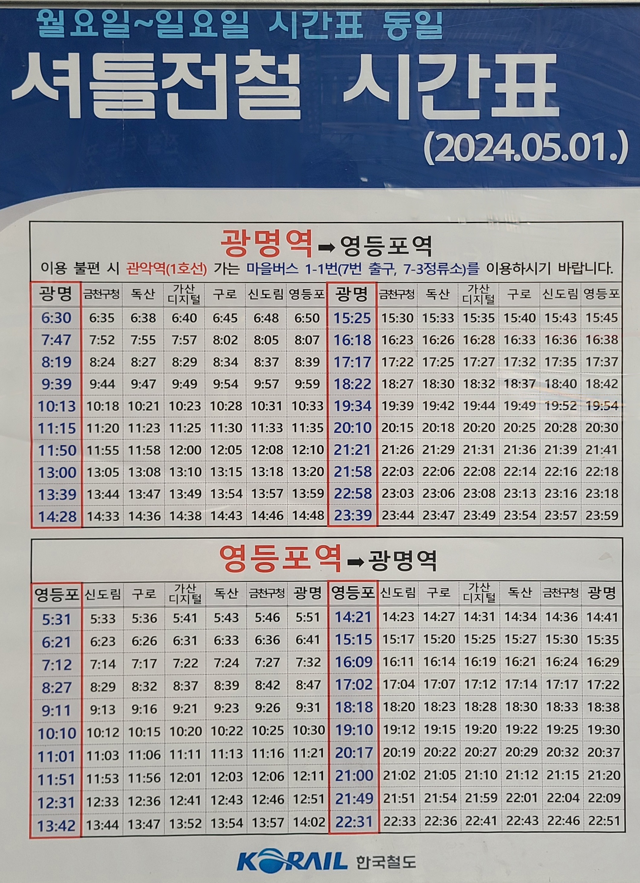 광명역과 영등포역 사이를 운행하는 광명전철 시간표.