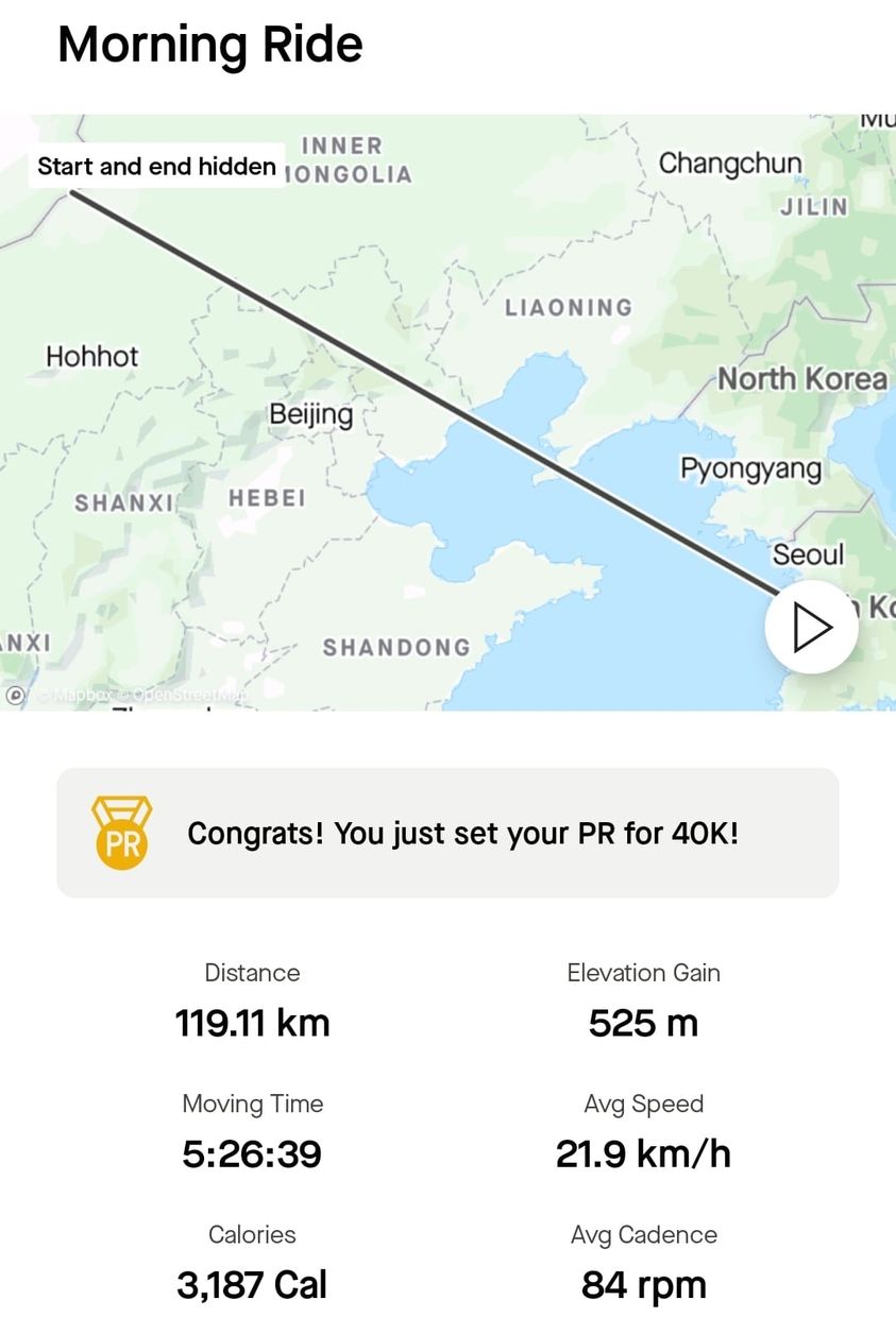 총 119km. GPS가 튀어서 마치 몽골에서 출발한 것처럼 기록되었다.